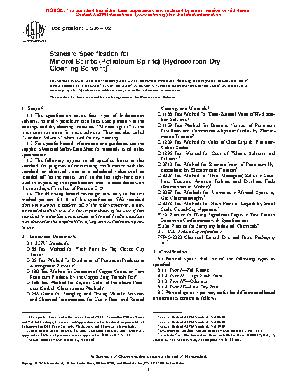 1.1 This specification covers four types of hydrocarbon solvents, normally petroleum distillates, used primarily in the coatings and dry-cleaning industries. “Mineral spirits” is the most common name for these solvents. They are also called “Stoddard Solvents” when used for dry cleaning.