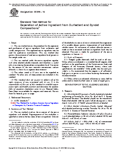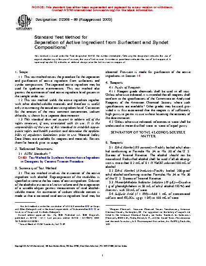 1.1 This test method covers the procedure for the separation and purification of active ingredient from surfactants and syndet compositions. The separated active ingredient may be used for qualitative examinations. This test method also permits the estimation of total active ingredient level present in the sample under test.