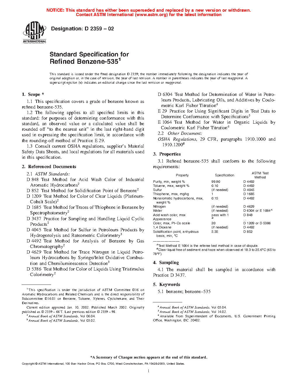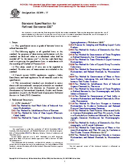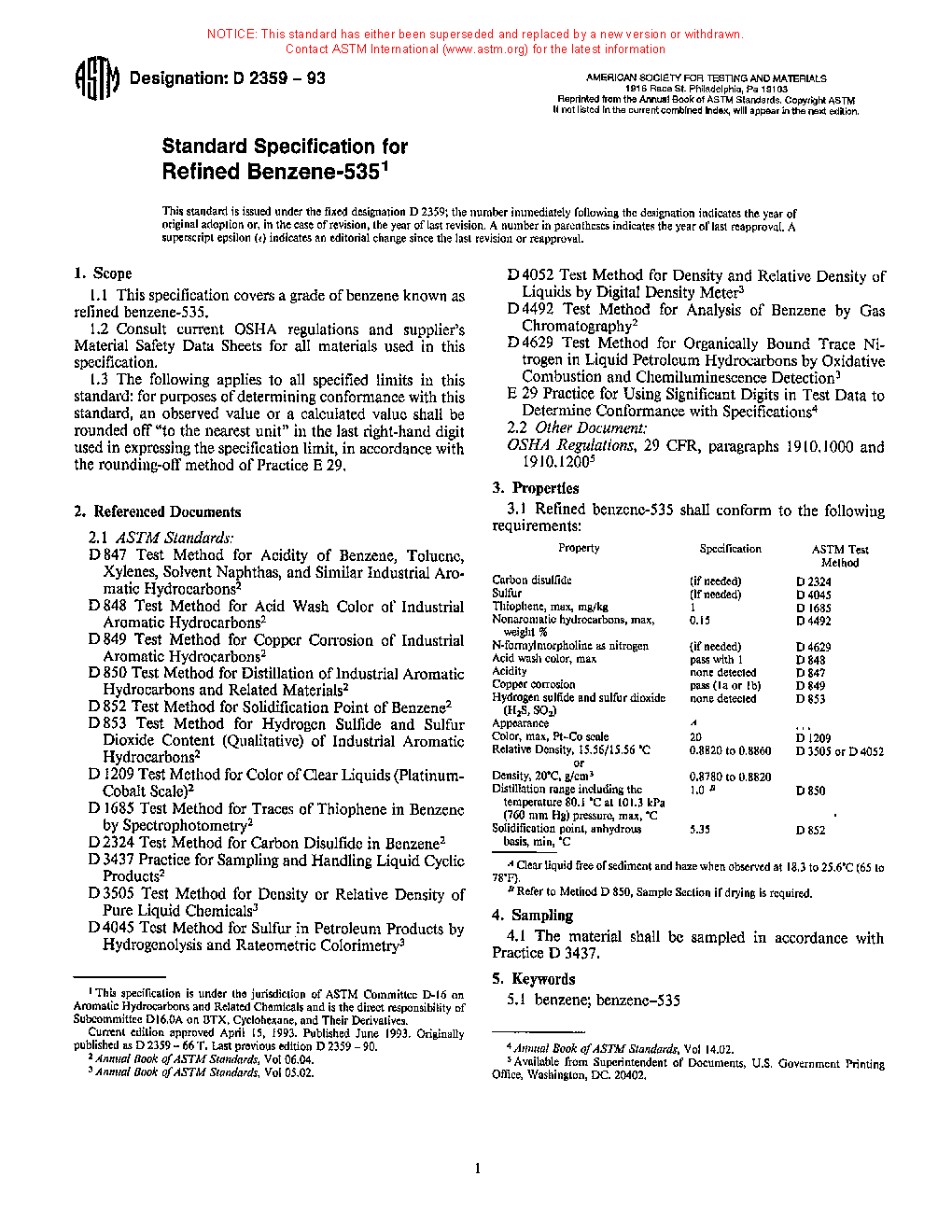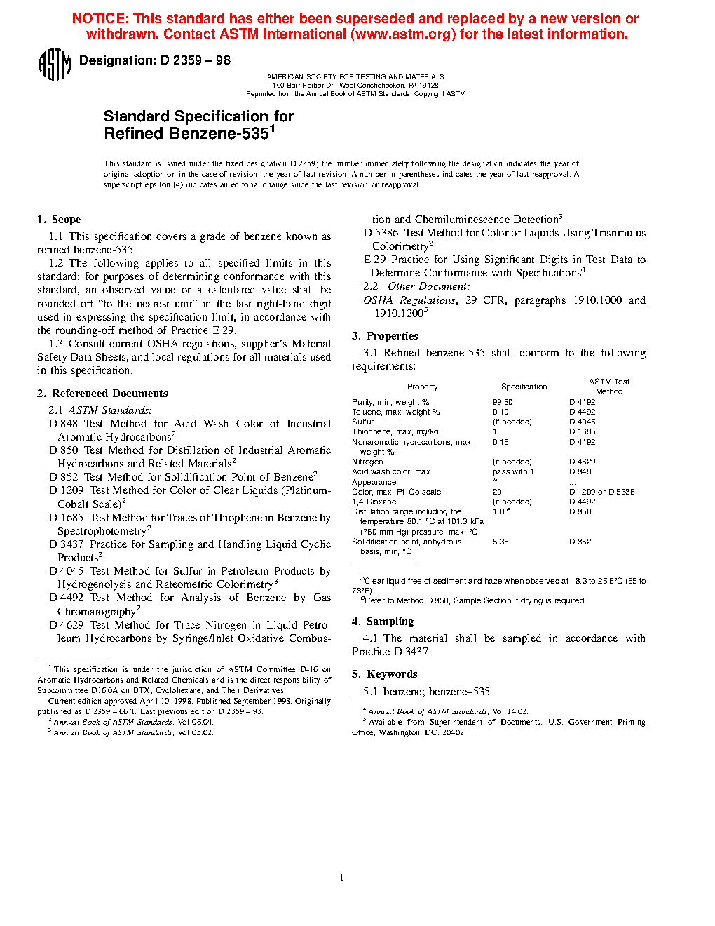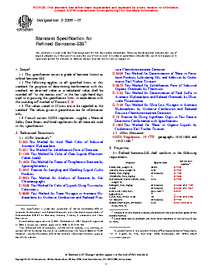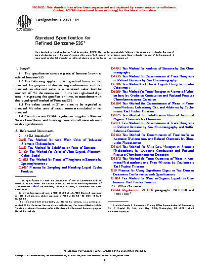 This specification covers a grade of benzene known as refined benzene-535. Different tests shall be performed in order to determine the following properties of refined benzene-535: minimum purity, maximum toluene content, maximum sulfur content, maximum thiophene content, maximum nonaromatic hydrocarbon content, maximum nitrogen content, water content, maximum acid wash color, appearance, maximum color, 1,4 dioxane content, and minimum solidification point with anhydrous basis.