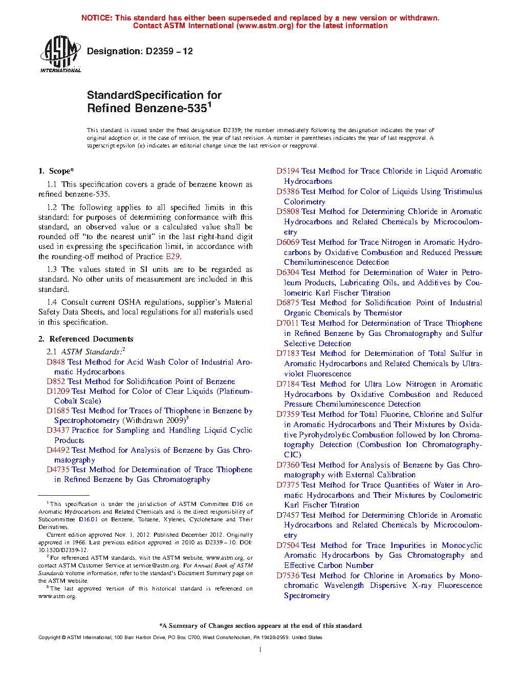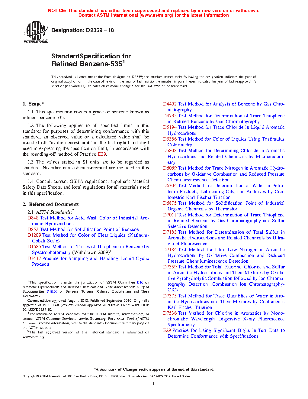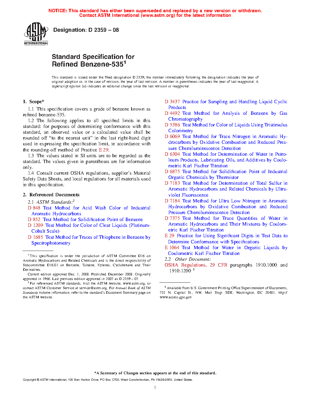 This specification covers a grade of benzene known as refined benzene-535. Different tests shall be performed in order to determine the following properties of refined benzene-535: minimum purity, maximum toluene content, maximum sulfur content, maximum thiophene content, maximum nonaromatic hydrocarbon content, maximum nitrogen content, water content, maximum acid wash color, appearance, maximum color, 1,4 dioxane content, and minimum solidification point with anhydrous basis.