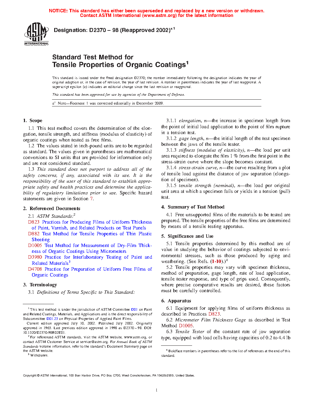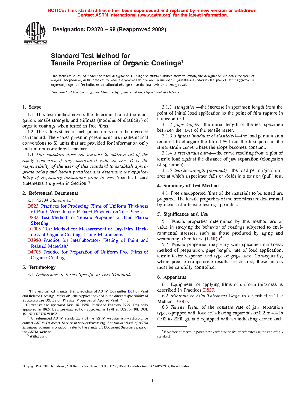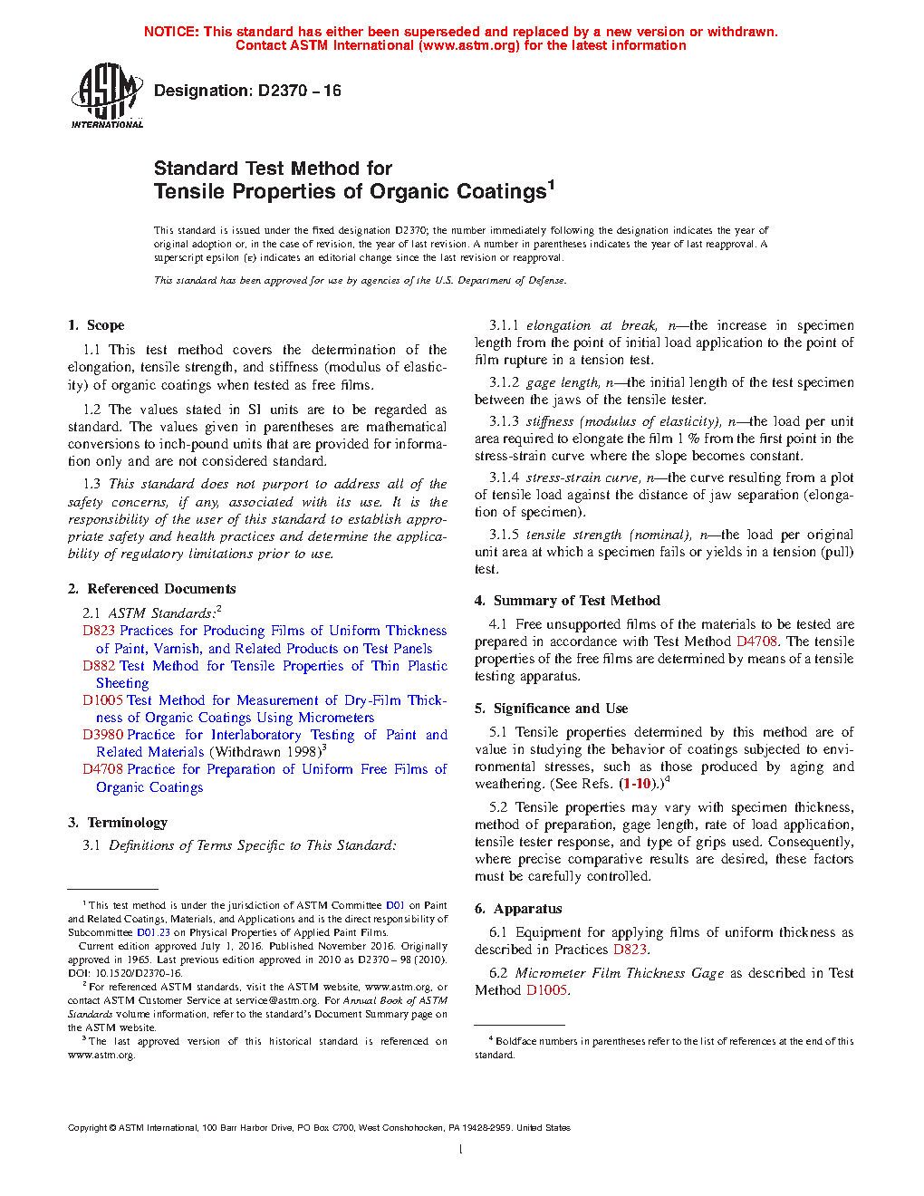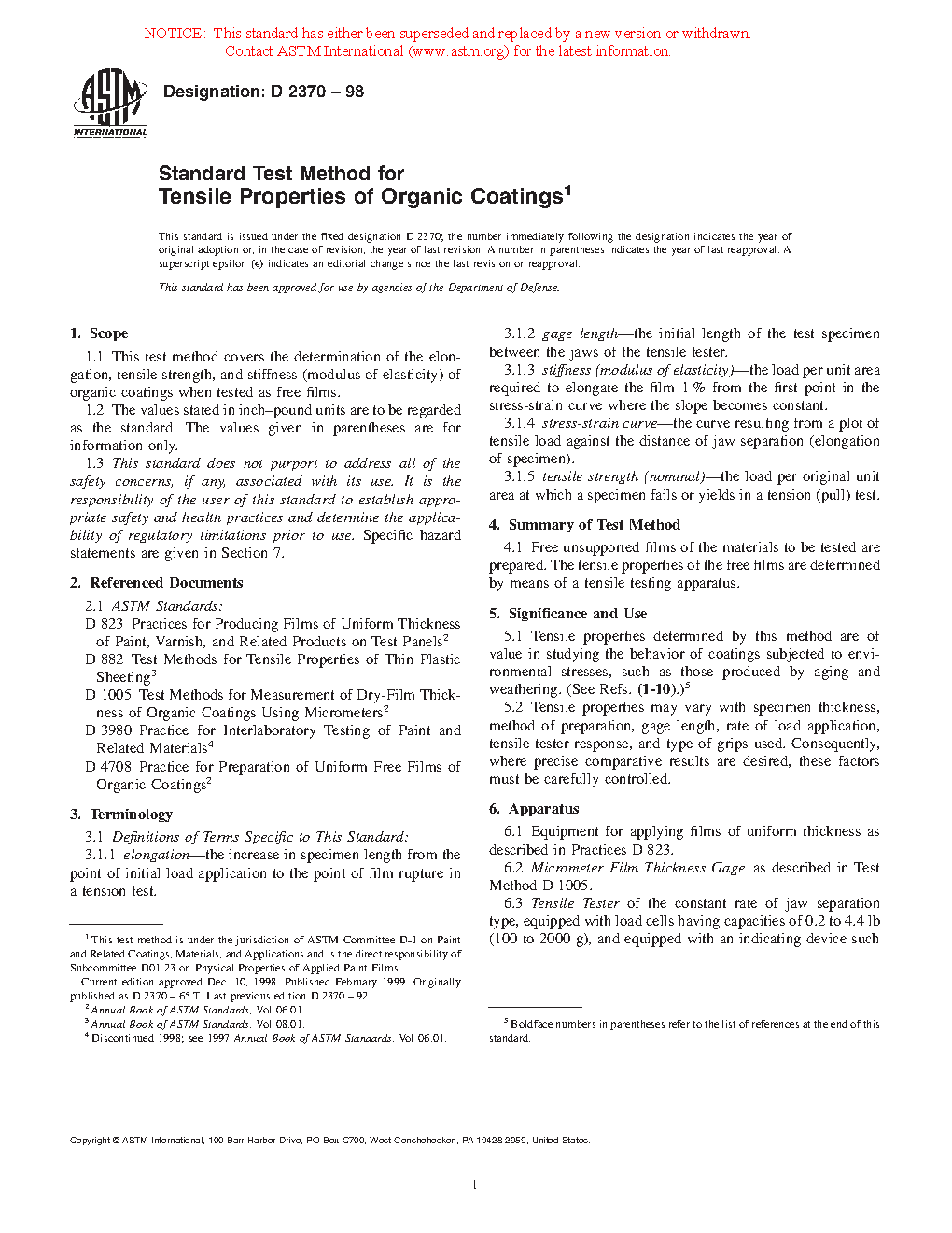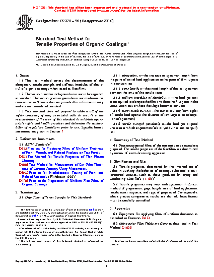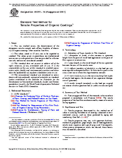1.1 This test method covers the determination of the elongation, tensile strength, and stiffness (modulus of elasticity) of organic coatings when tested as free films.