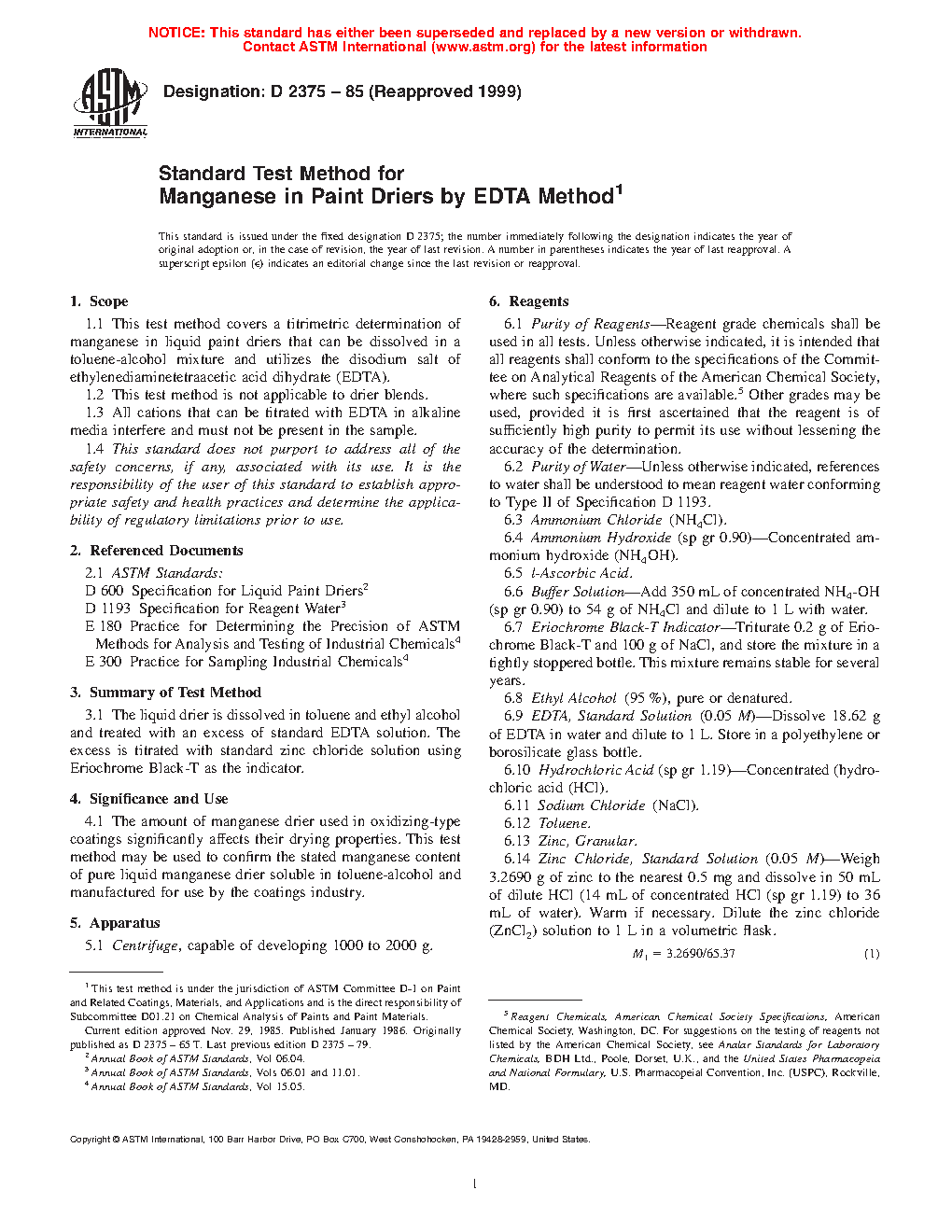 1.1 This test method covers a titrimetric determination of manganese in liquid paint driers that can be dissolved in a toluene-alcohol mixture and utilizes the disodium salt of ethylenediaminetetraacetic acid dihydrate (EDTA).