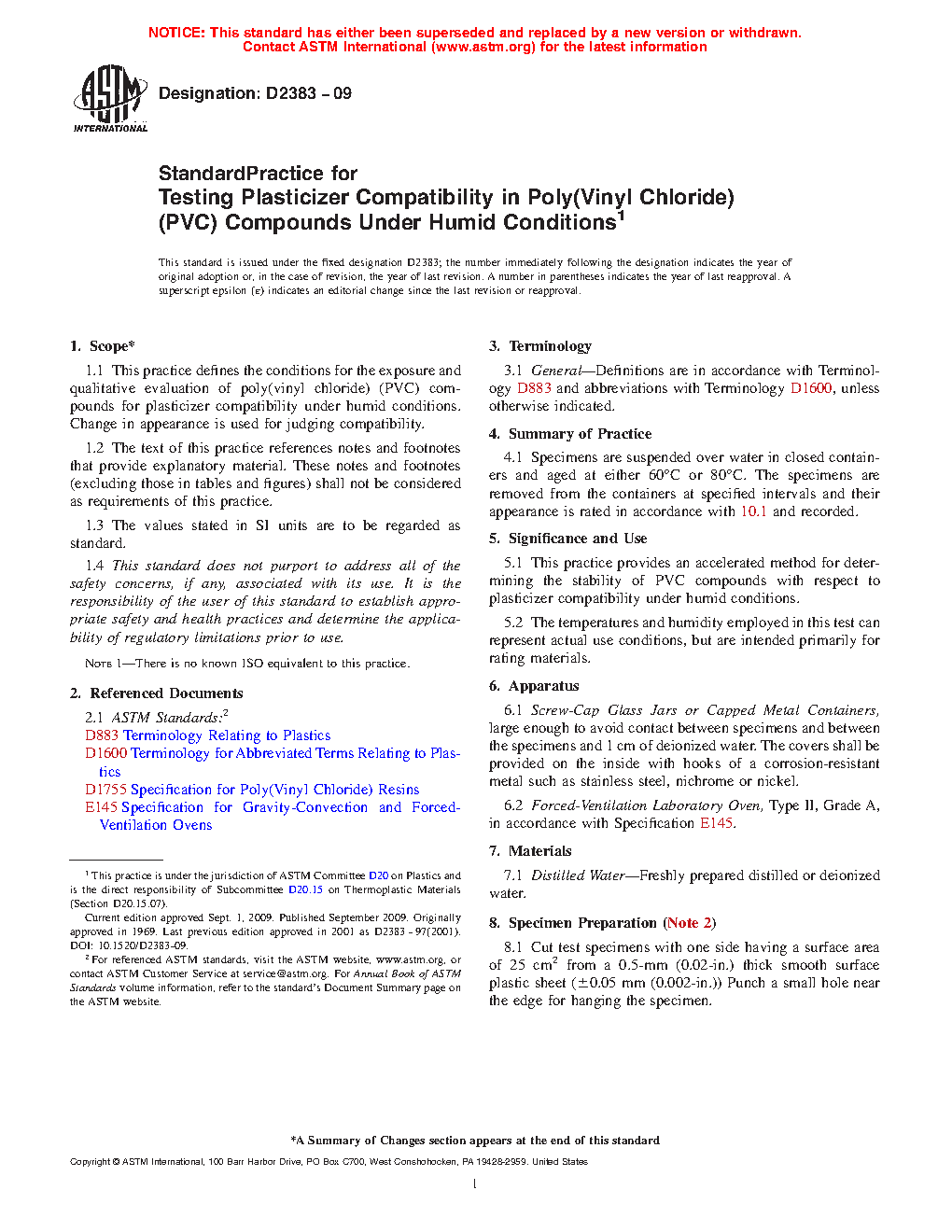 5.1 This test method provides an accelerated method for determining the stability of plasticized PVC compounds with respect to plasticizer compatibility under humid conditions.