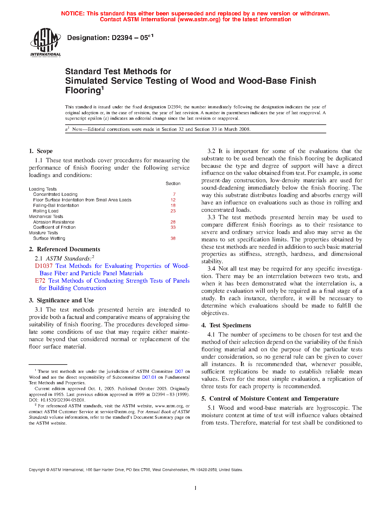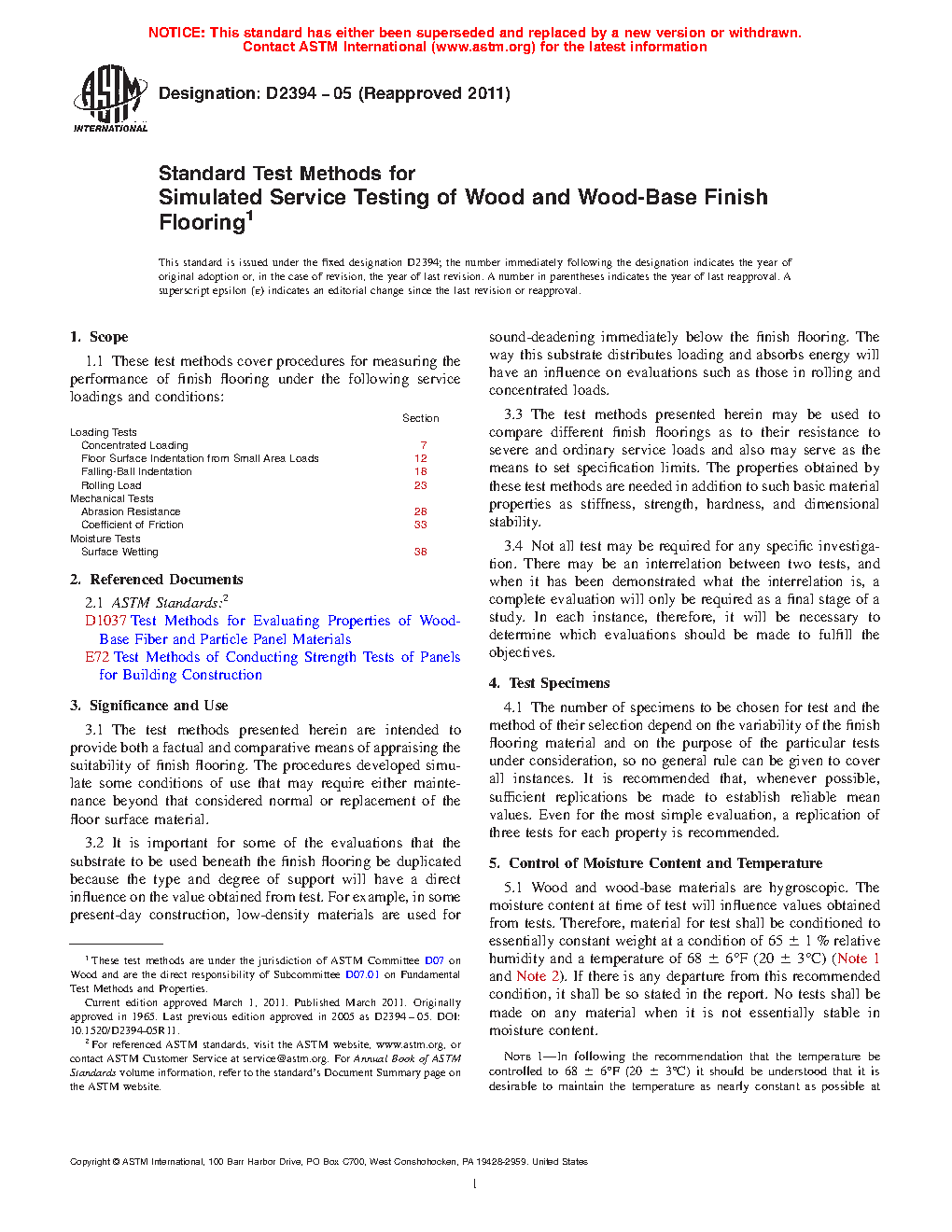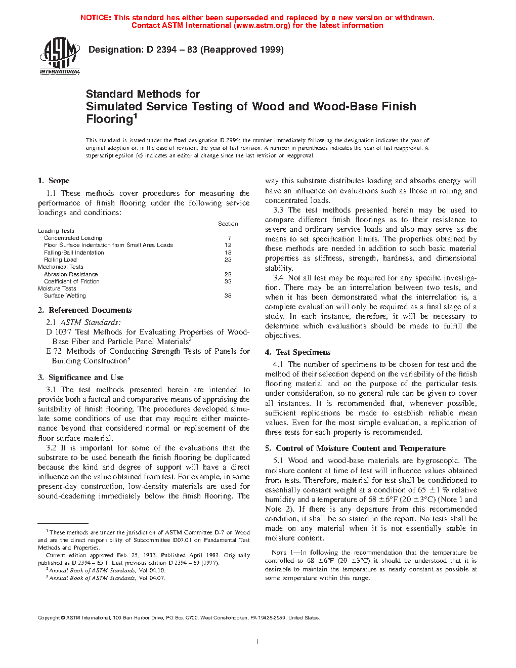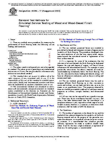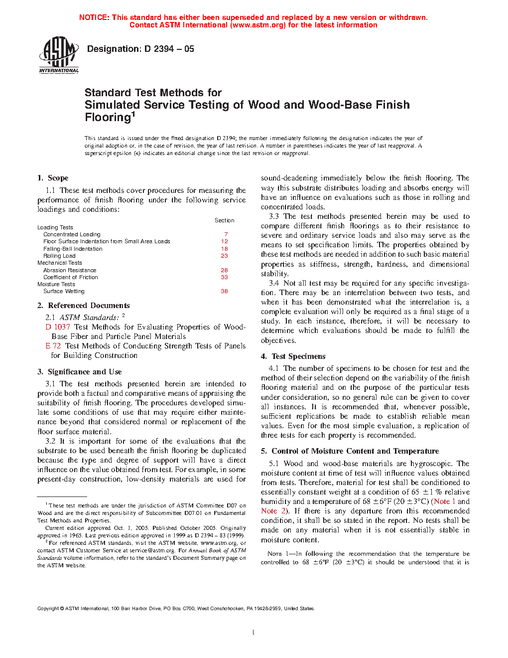 3.1 The test methods presented herein are intended to provide both a factual and comparative means of appraising the suitability of finish flooring. The procedures developed simulate some conditions of use that may require either maintenance beyond that considered normal or replacement of the floor surface material.
