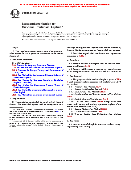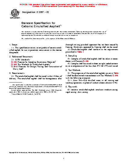 This specification covers the seven grades of cationic emulsified asphalt for use in pavement construction. The asphalt shall be homogeneous after thorough mixing provided separation has not been caused by freezing and shall conform to the requirements set for viscosity, storage stability, demulsibility, coating ability and water resistance, particle charge, and distillation.