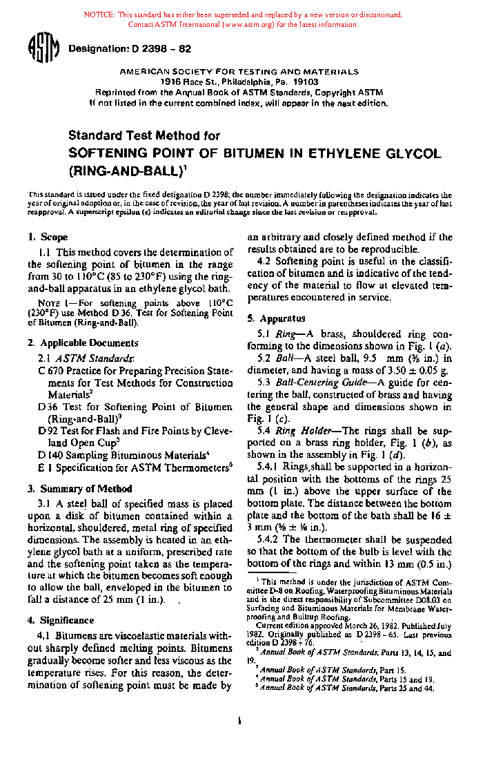 Test Method for Softening Point of Bitumen in Ethylene Glycol (Ring-and-Ball) (Withdrawn 1984)