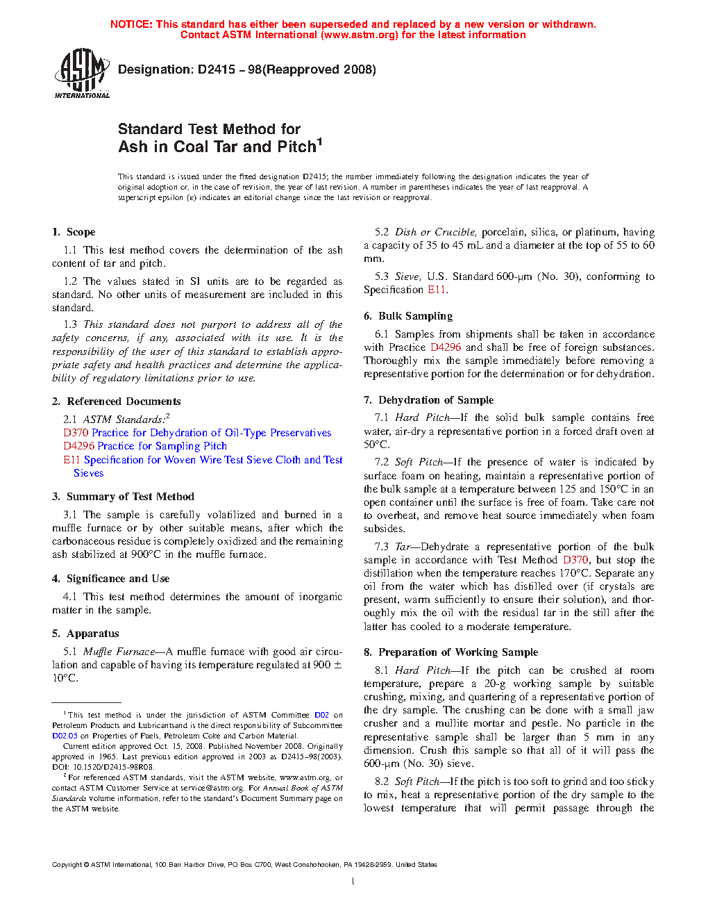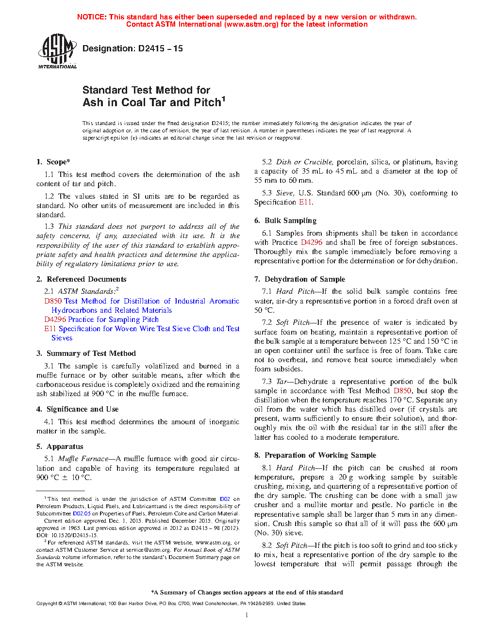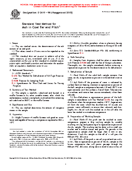 1.1 This test method covers the determination of the ash content of tar and pitch.