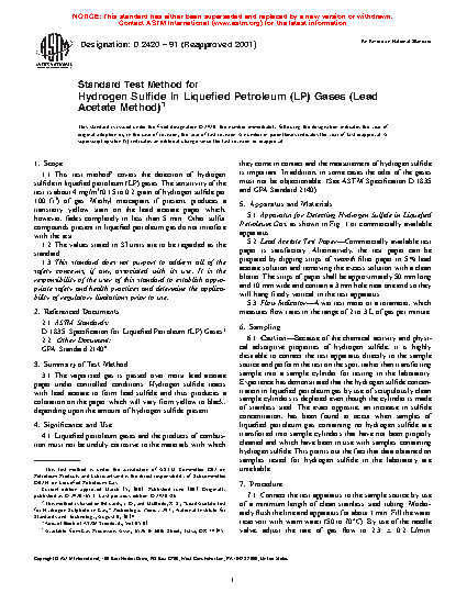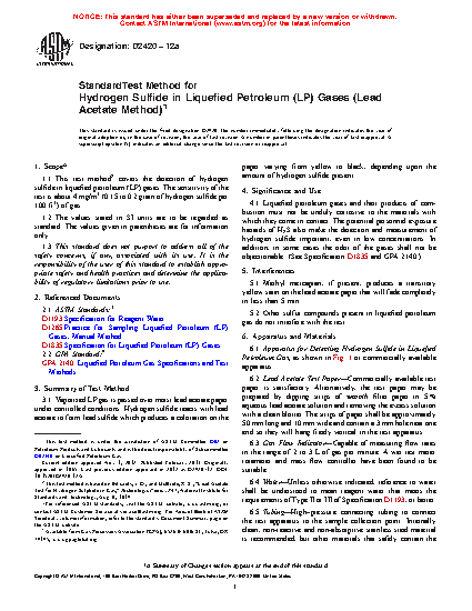 1.1 This test method2 covers the detection of hydrogen sulfide in liquefied petroleum (LP) gases. The sensitivity of the test is about 4 mg/m3 (0.15 to 0.2 grain of hydrogen sulfide per 100 ft3) of gas.