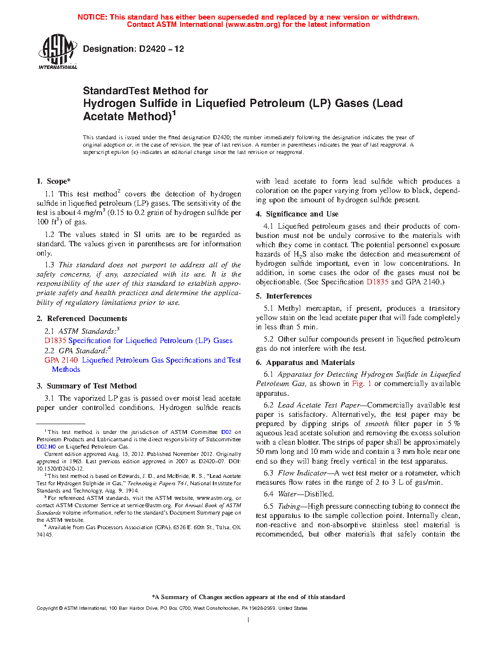 4.1 Liquefied petroleum gases and their products of combustion must not be unduly corrosive to the materials with which they come in contact. The potential personnel exposure hazards of H2S also make the detection and measurement of hydrogen sulfide important, even in low concentrations. In addition, in some cases the odor of the gases shall not be objectionable. (See Specification D1835 and GPA 2140.)
