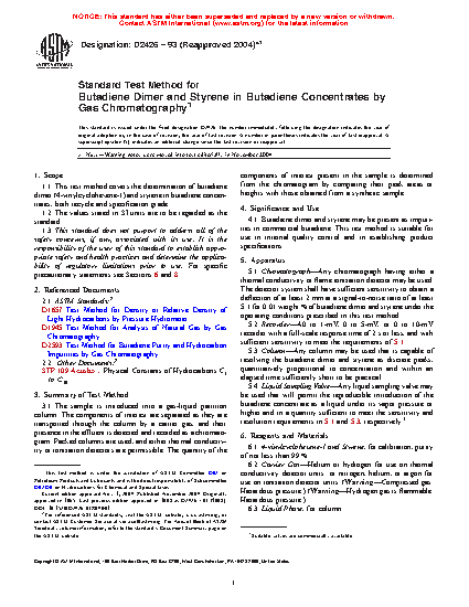 1.1 This test method covers the determination of butadiene dimer (4-vinylcyclohexene-1) and styrene in butadiene concentrates, both recycle and specification grade.