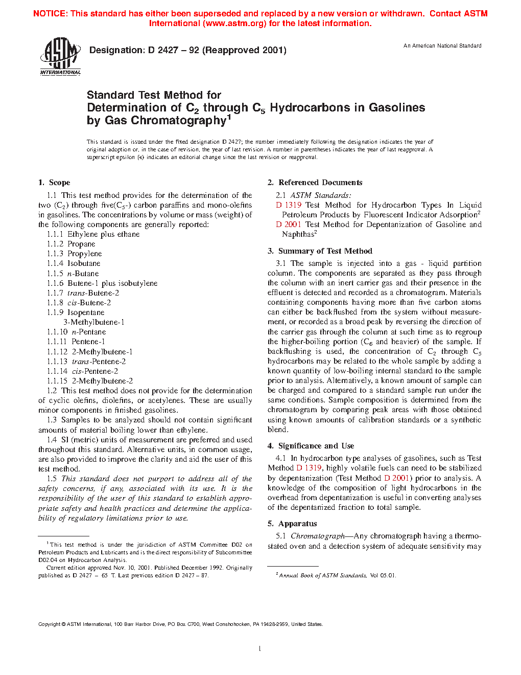 1.1 This test method covers the determination of the two (C2) through five (C5-) carbon paraffins and mono-olefins in gasolines. The concentrations by volume or mass (weight) of the following components are generally reported: