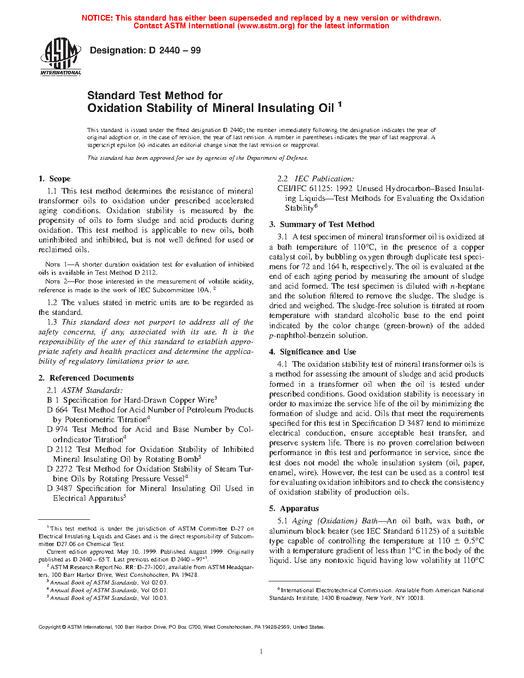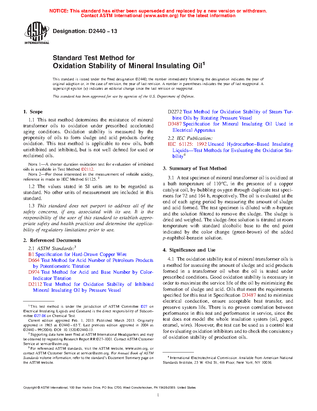 4.1 The oxidation stability test of mineral transformer oils is a method for assessing the amount of sludge and acid products formed in a transformer oil when the oil is tested under prescribed conditions. Good oxidation stability is necessary in order to maximize the service life of the oil by minimizing the formation of sludge and acid. Oils that meet the requirements specified for this test in Specification D3487 tend to minimize electrical conduction, ensure acceptable heat transfer, and preserve system life. There is no proven correlation between performance in this test and performance in service, since the test does not model the whole insulation system (oil, paper, enamel, wire). However, the test can be used as a control test for evaluating oxidation inhibitors and to check the consistency of oxidation stability of production oils.