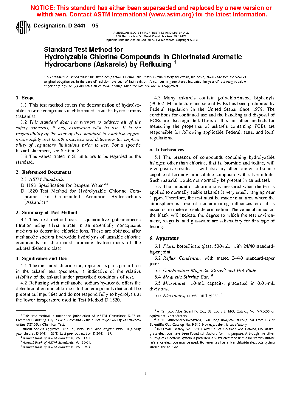 Standard Test Method for Hydrolyzable Chlorine Compounds in Chlorinated Aromatic Hydrocarbons (Askarels) by Refluxing (Withdrawn 2000)