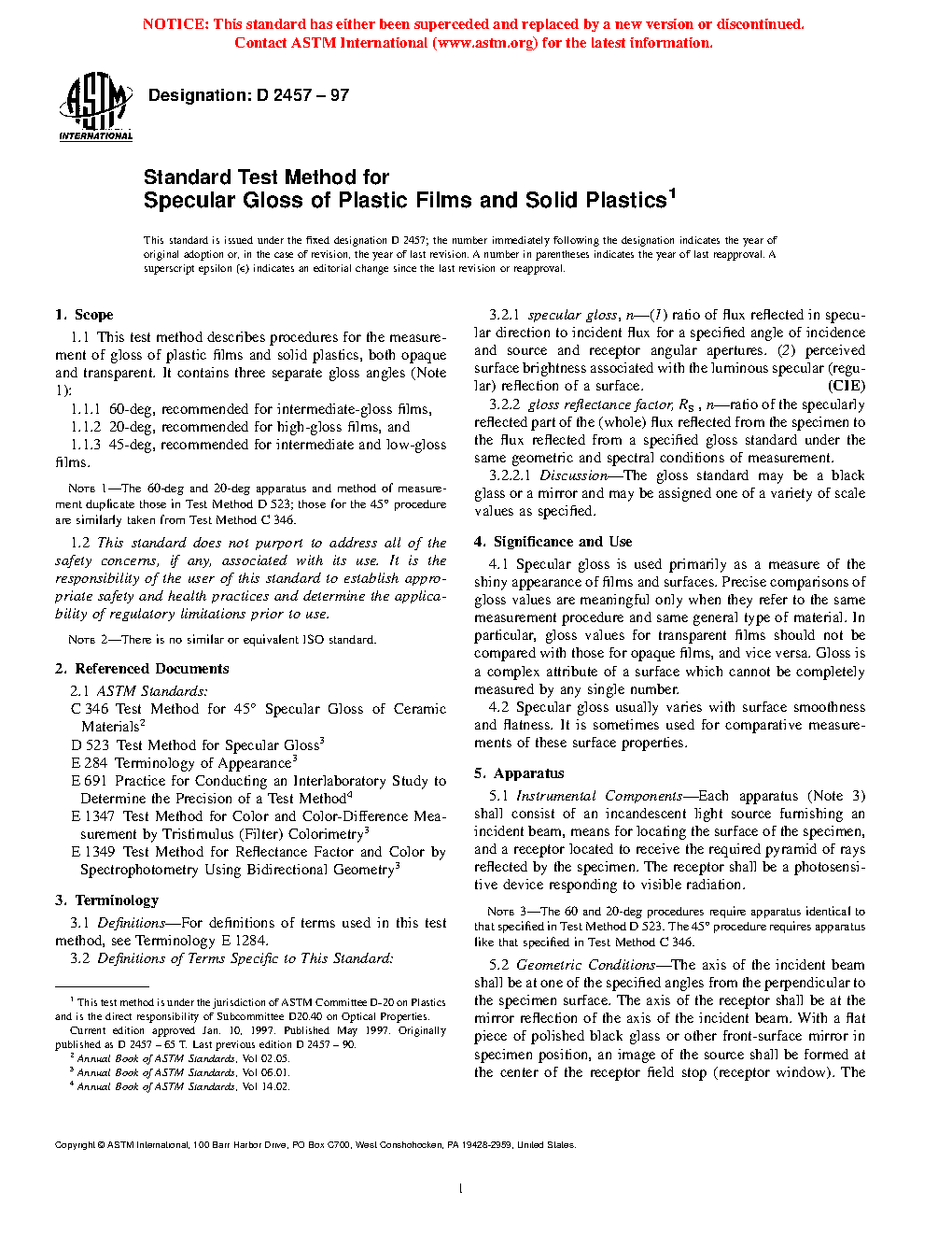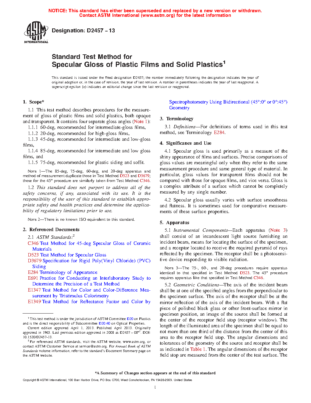 1.1 This test method describes procedures for the measurement of gloss of plastic films and solid plastics, both opaque and transparent. It contains four separate gloss angles (Note 1):