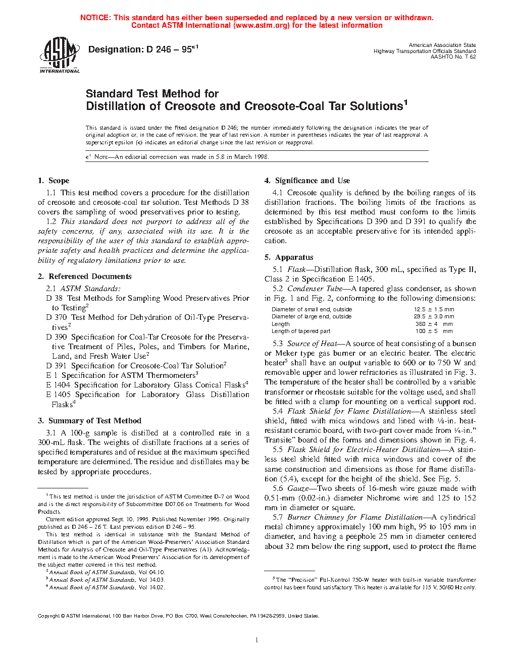 1.1 This test method covers a procedure for the distillation of creosote and creosote-coal tar solution. Test Methods D38 covers the sampling of wood preservatives prior to testing.
