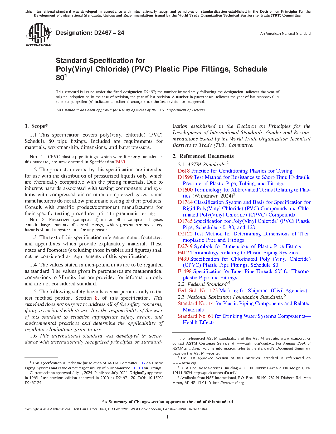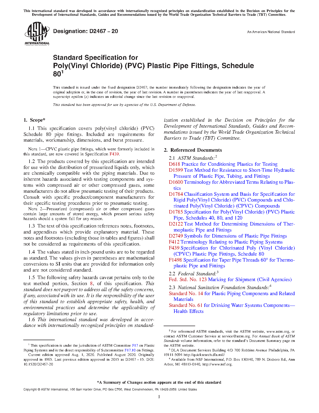 1.1 This specification covers poly(vinyl chloride) (PVC) Schedule 80 pipe fittings. Included are requirements for materials, workmanship, dimensions, and burst pressure.