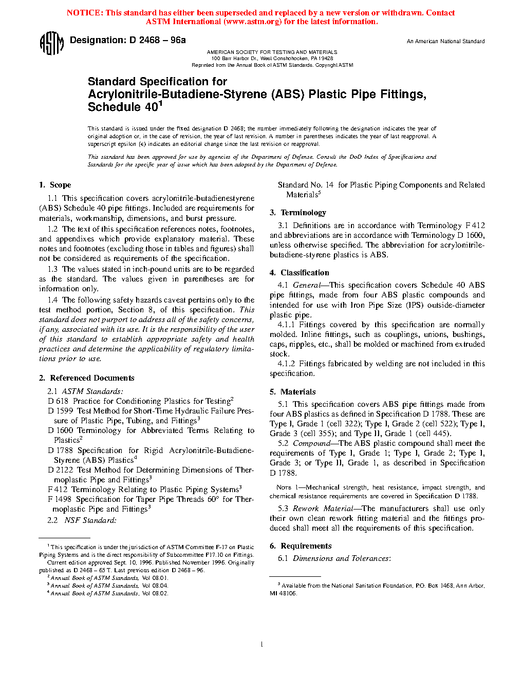 1.1 This specification covers acrylonitrile-butadiene-styrene (ABS) Schedule 40 pipe fittings. Included are requirements for materials, workmanship, dimensions, and burst pressure.