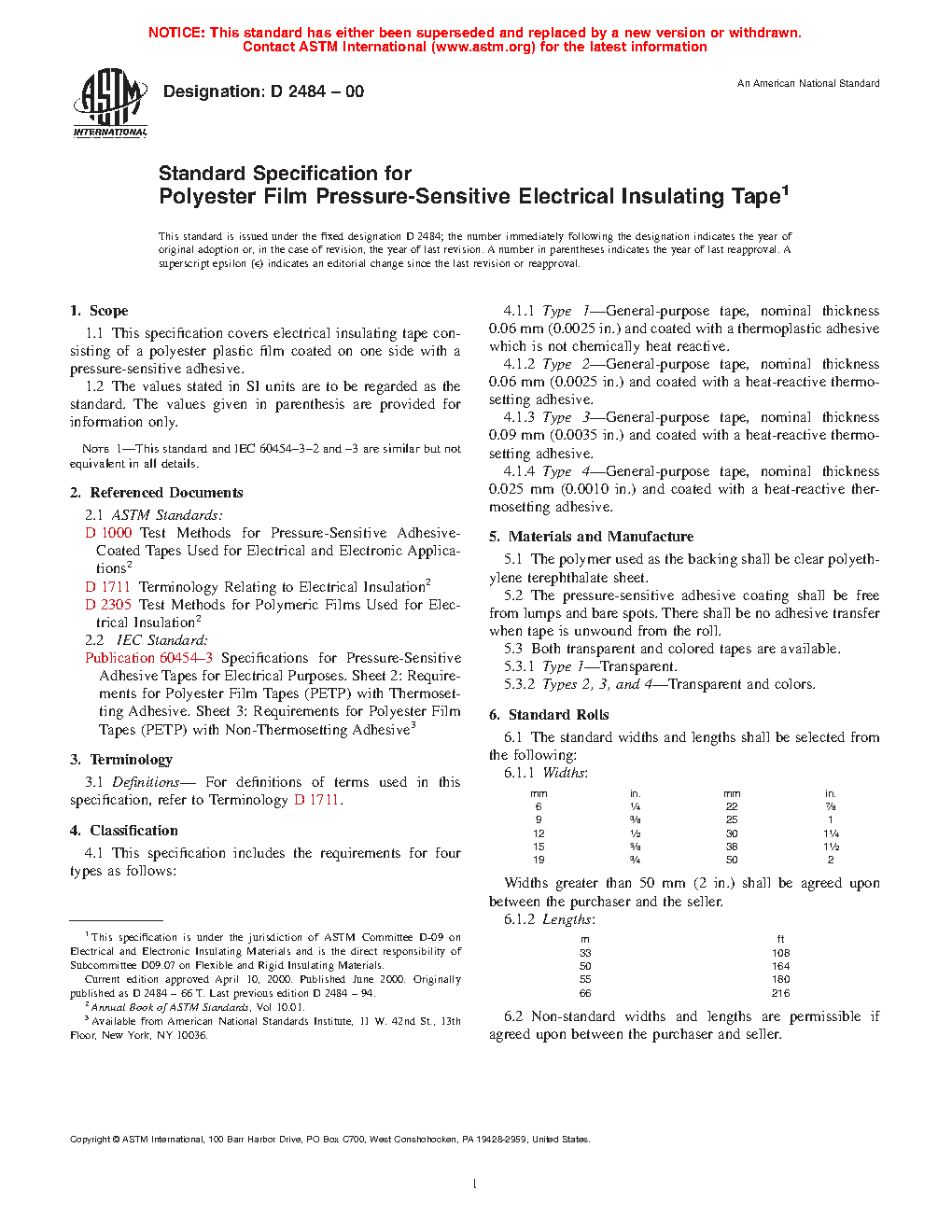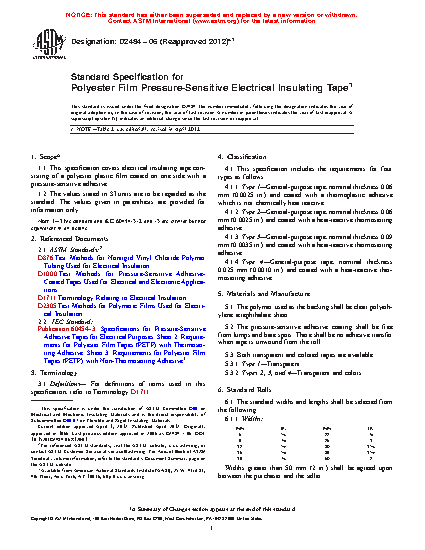 This specification covers the manufacture, testing, and standard requirements of four types of electrical insulating tape consisting of a polyester plastic film coated on one side with a pressure-sensitive adhesive. Besides differences in nominal thickness, Type 1 is a general-purpose tape coated with a thermoplastic adhesive that is not chemically heat reactive, while Types 2, 3, and 4 are general-purpose tapes coated with a heat-reactive thermosetting adhesive. The tapes shall be tested accordingly and consequently conform to standard widths, lengths, and thicknesses, and other specific properties such as elongation, penetraction, high-humidity insulation resistance (measure of corrosion), strain relief (shrinkage), breaking strength, dielectric breakdown, and adhesion to steel and backing.