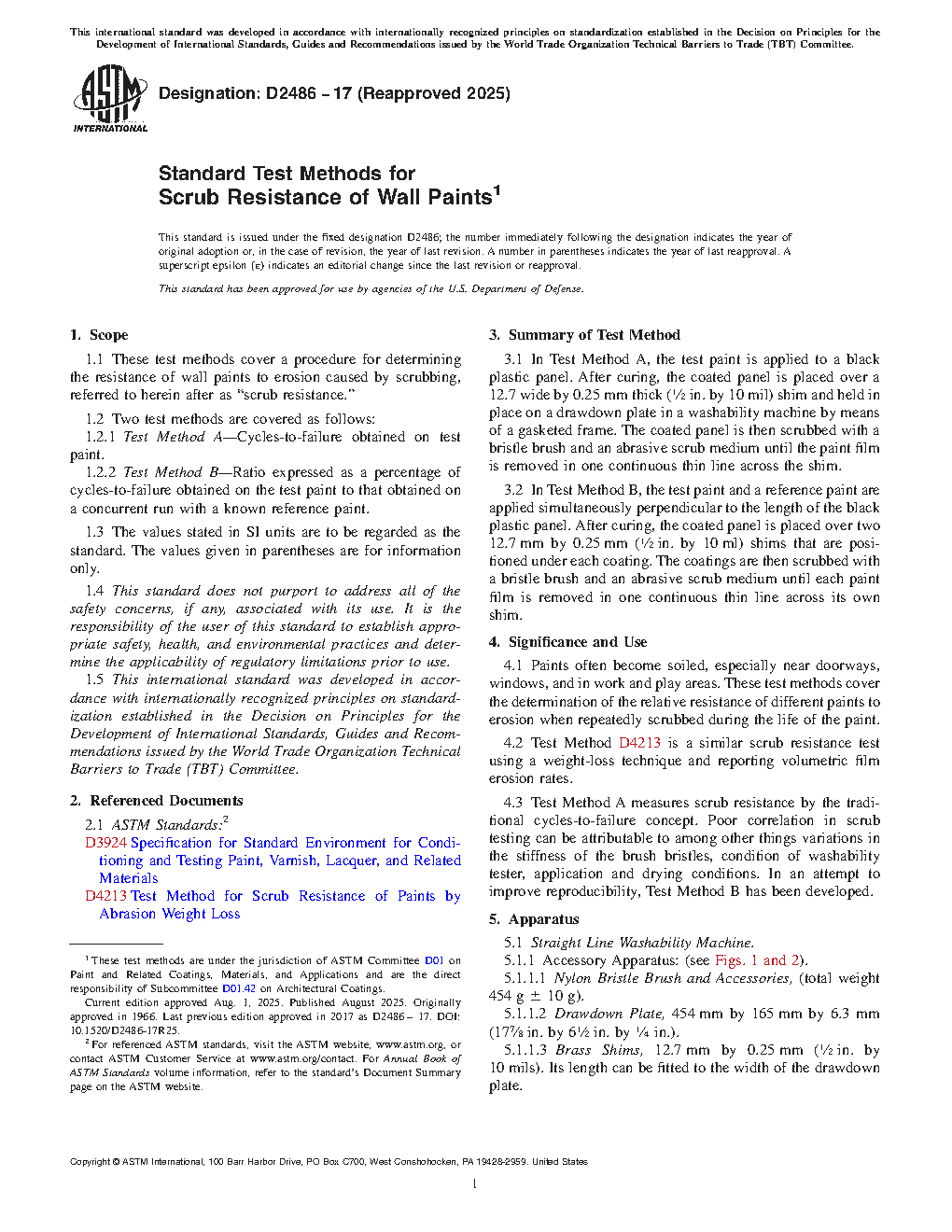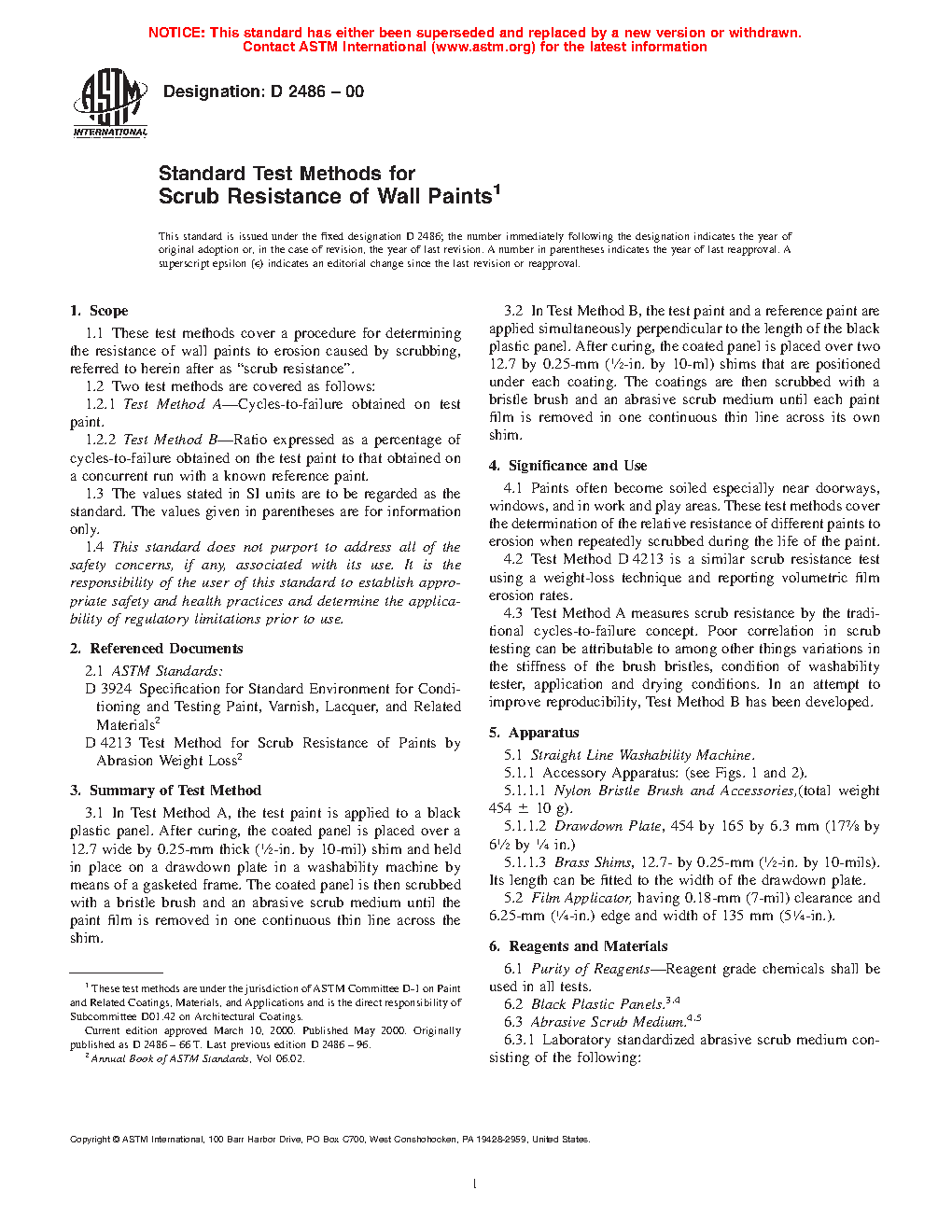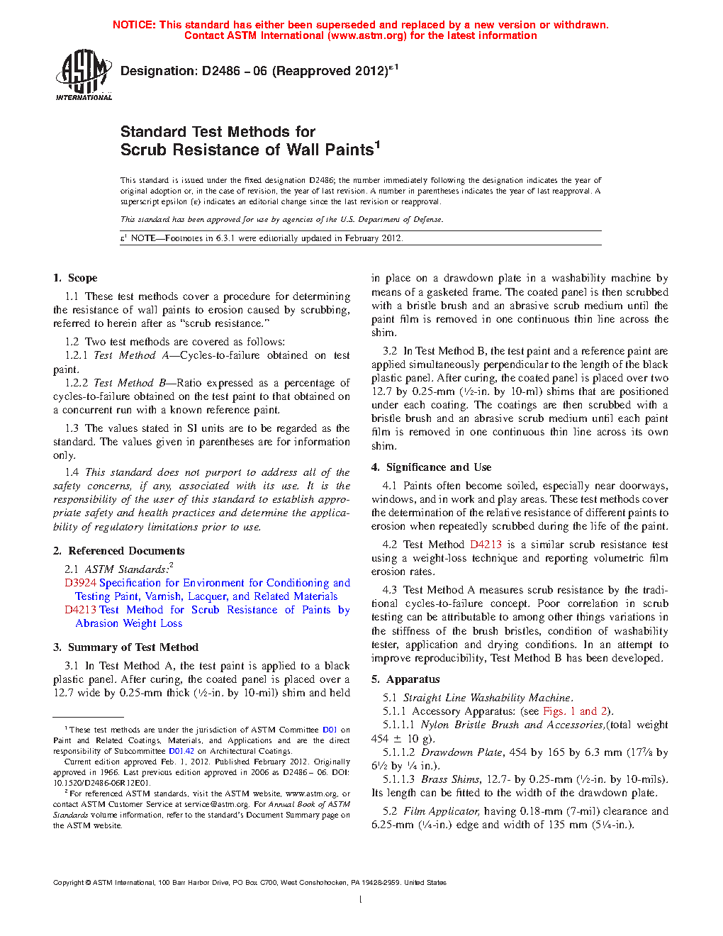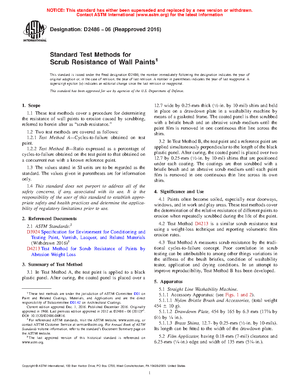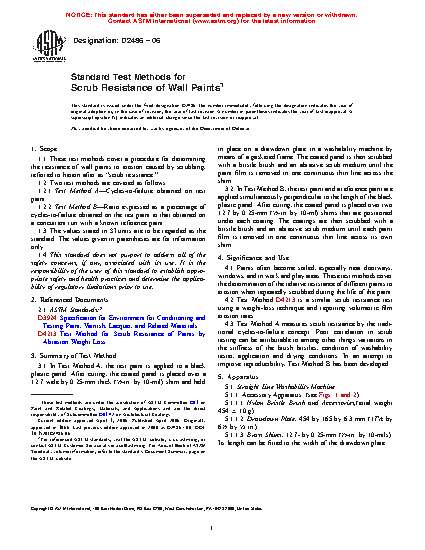 1.1 These test methods cover a procedure for determining the resistance of wall paints to erosion caused by scrubbing, referred to herein after as “scrub resistance.”