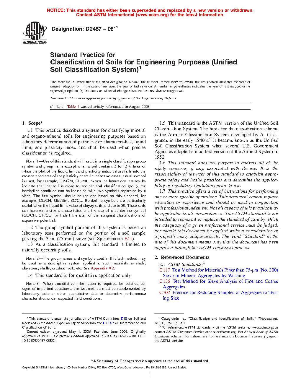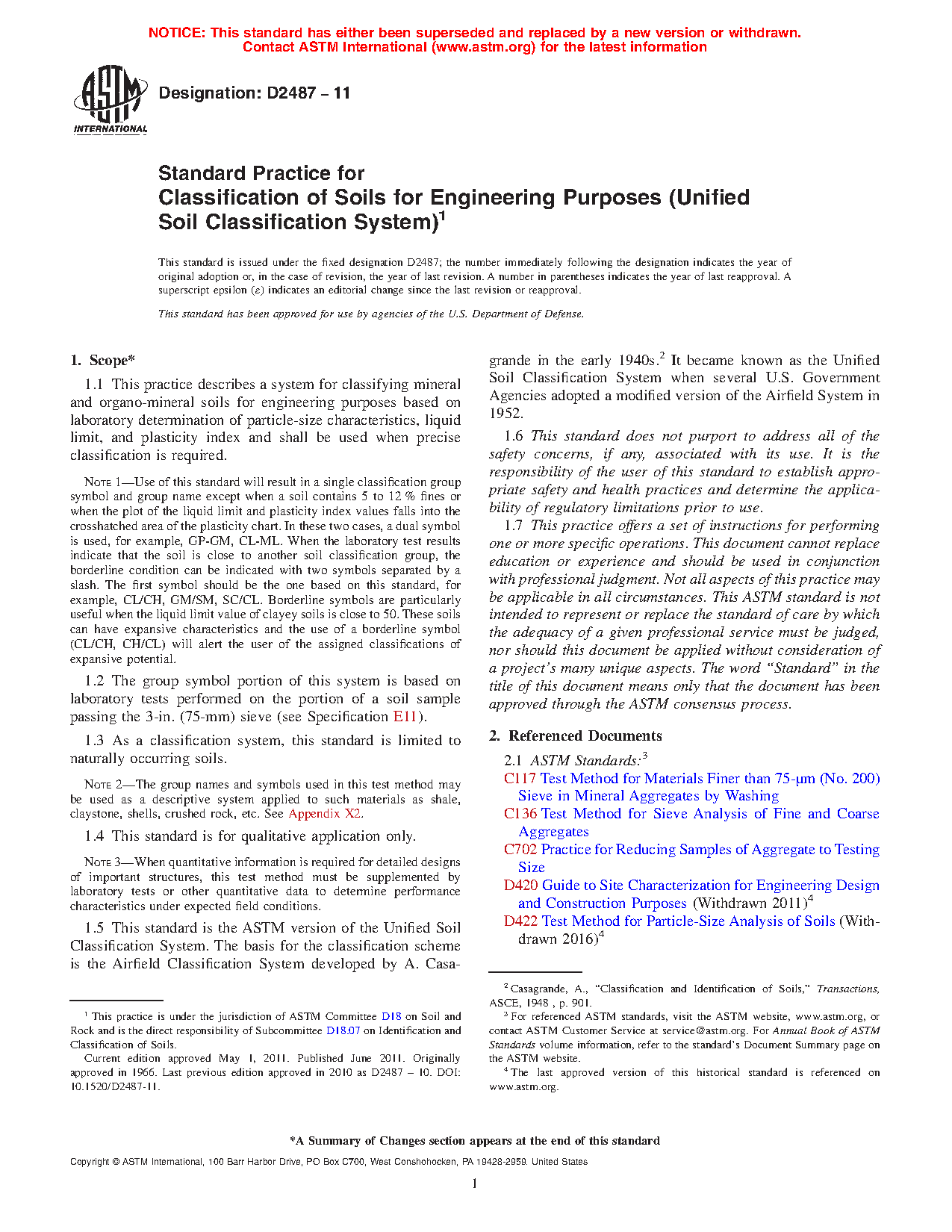 1.5 This standard is the ASTM version of the Unified Soil Classification System. The basis for the classification scheme is the Airfield Classification System developed by A. Casagrande in the early 1940s.2 It became known as the Unified Soil Classification System when several U.S. Government Agencies adopted a modified version of the Airfield System in 1952.