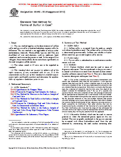 1.1 This test method applies to the determination of sulfate sulfur and pyritic sulfur in coal and calculates organic sulfur by difference. This test method is not applicable to coke or other carbonaceous materials. Monosulfides (pyrites and FeS2 are disulfides) of iron and elements such as cadmium, lead, vanadium, and zinc can be present in coal. In the range of 0 to 100 ppm, these monosulfides do not contribute significantly to the total inorganic sulfide content.