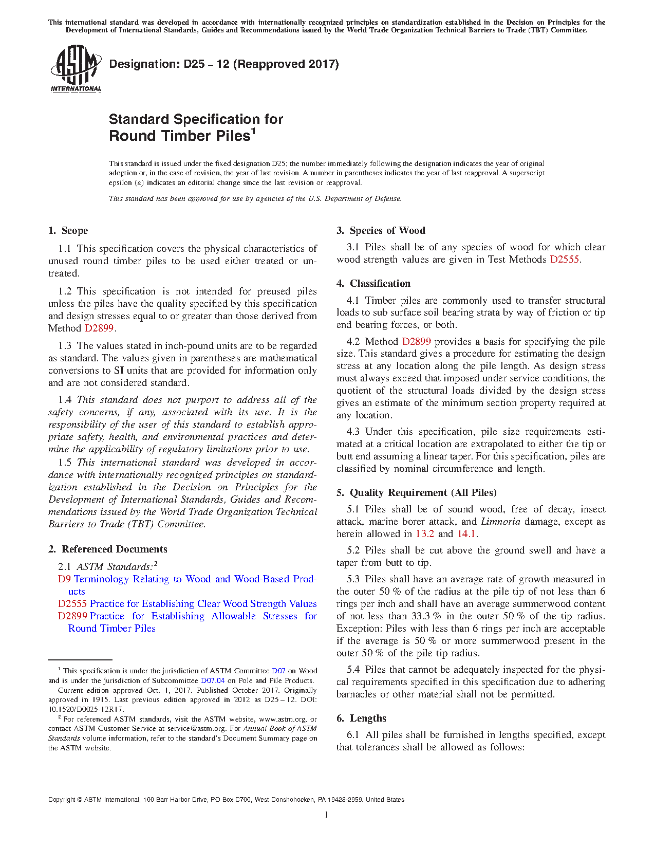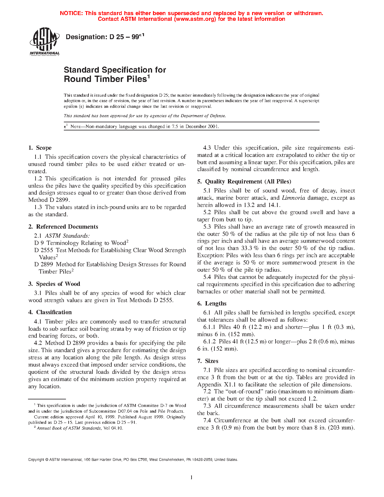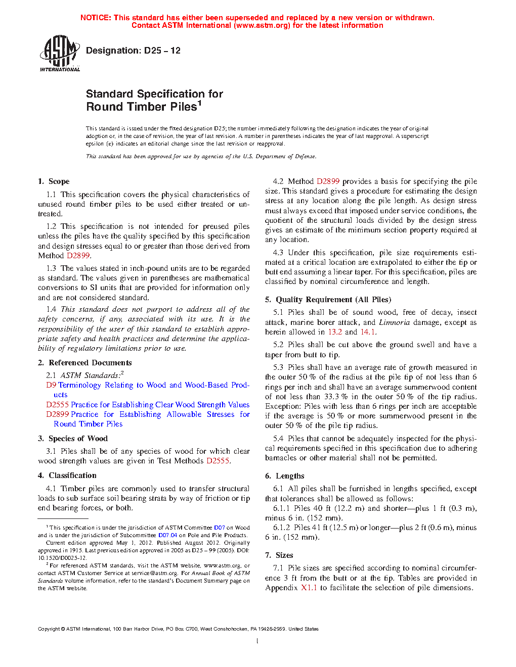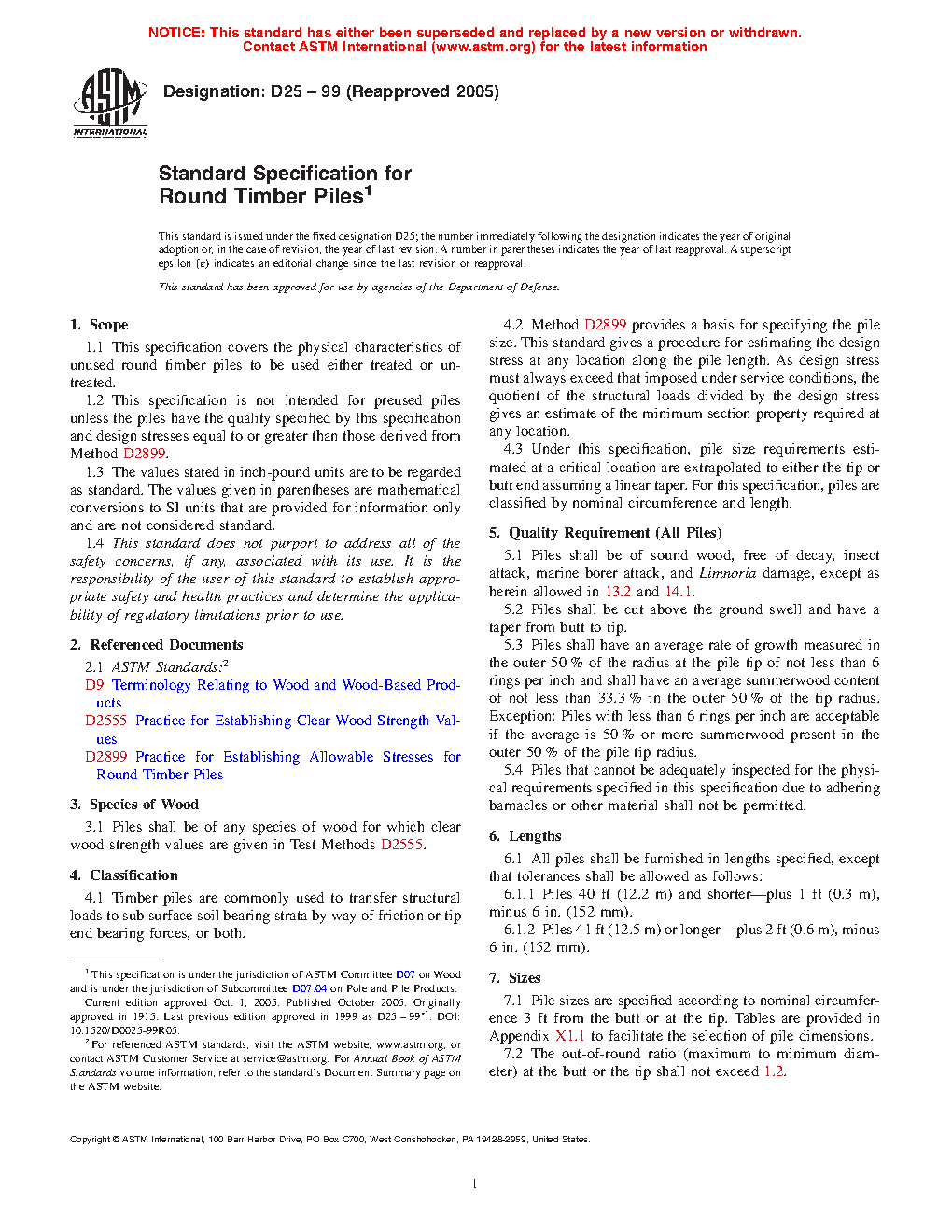 1.1 This specification covers the physical characteristics of unused round timber piles to be used either treated or untreated.