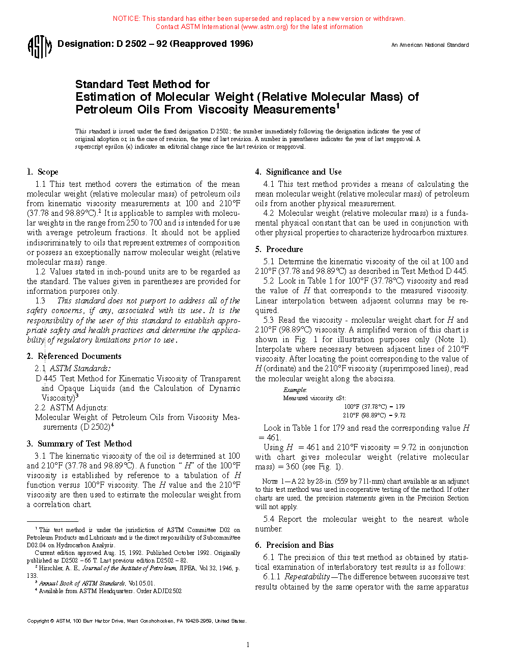 1.1 This test method covers the estimation of the mean relative molecular mass of petroleum oils from kinematic viscosity measurements at 100 °F and 210 °F (37.78 °C and 98.89 °C).2 It is applicable to samples with mean relative molecular masses in the range from 250 to 700 and is intended for use with average petroleum fractions. It should not be applied indiscriminately to oils that represent extremes of composition or possess an exceptionally narrow mean relative molecular mass range.