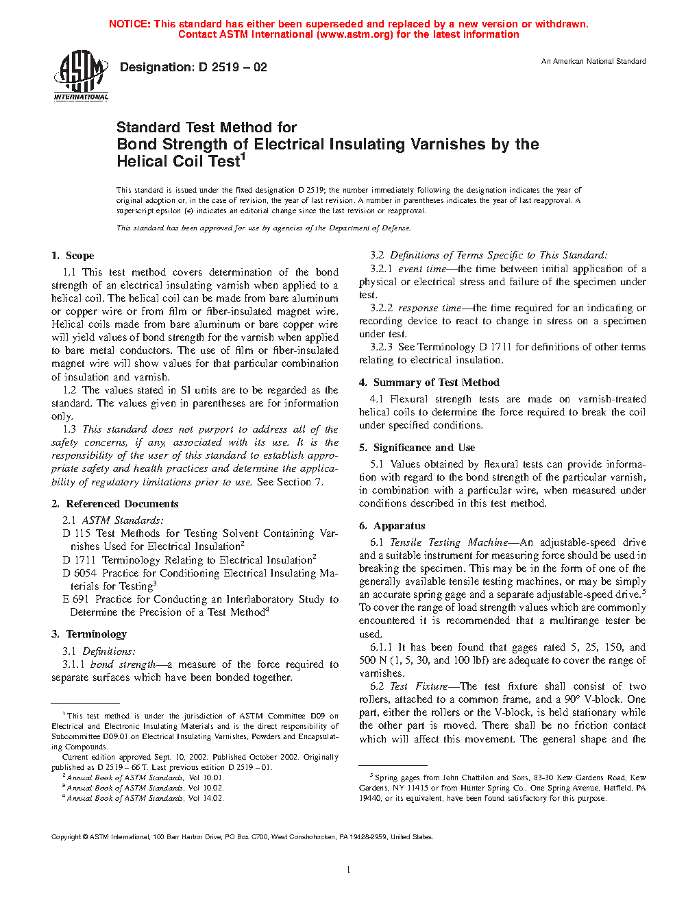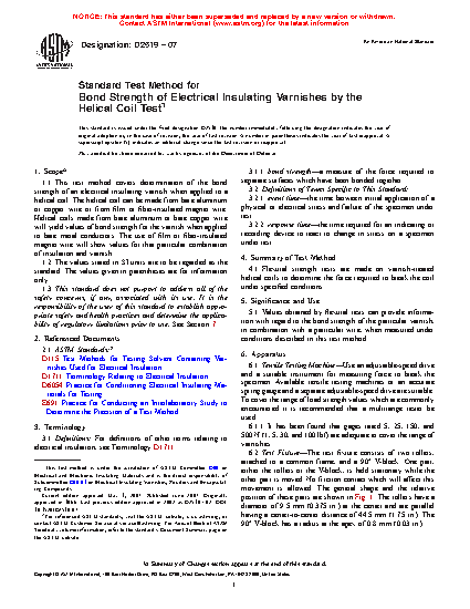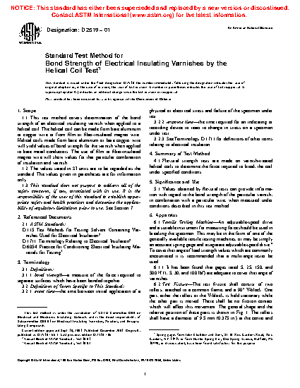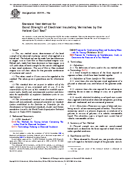 1.1 This test method covers determination of the bond strength of an electrical insulating varnish when applied to a helical coil. The helical coil can be made from bare aluminum or copper wire or from film or fiber-insulated magnet wire. Helical coils made from bare aluminum or bare copper wire will yield values of bond strength for the varnish when applied to bare metal conductors. The use of film or fiber-insulated magnet wire will show values for that particular combination of insulation and varnish.