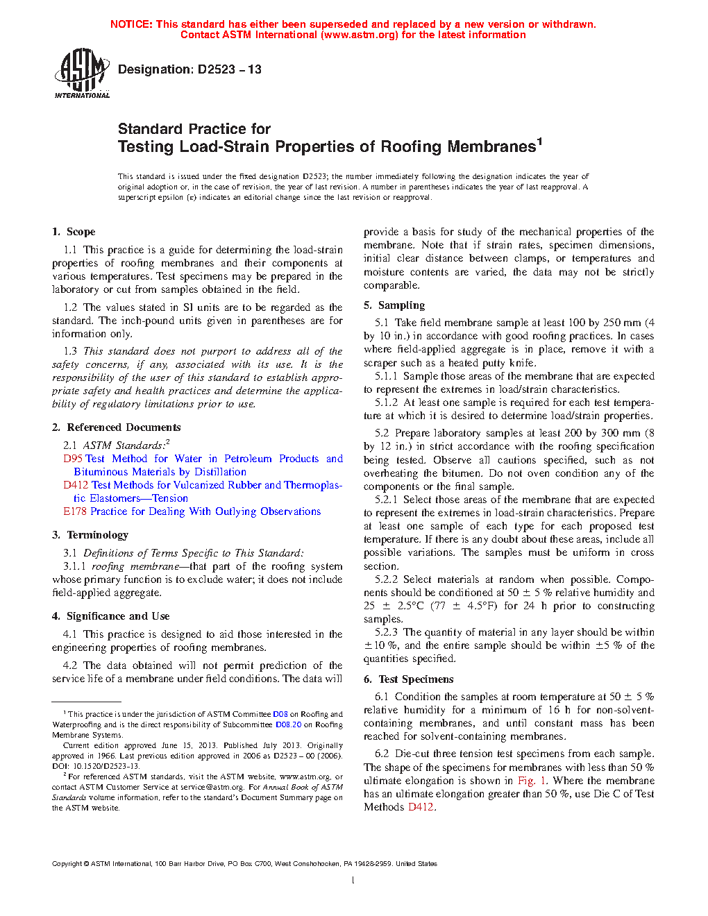 1.1 This practice is a guide for determining the load-strain properties of roofing membranes and their components at various temperatures. Test specimens may be prepared in the laboratory or cut from samples obtained in the field.