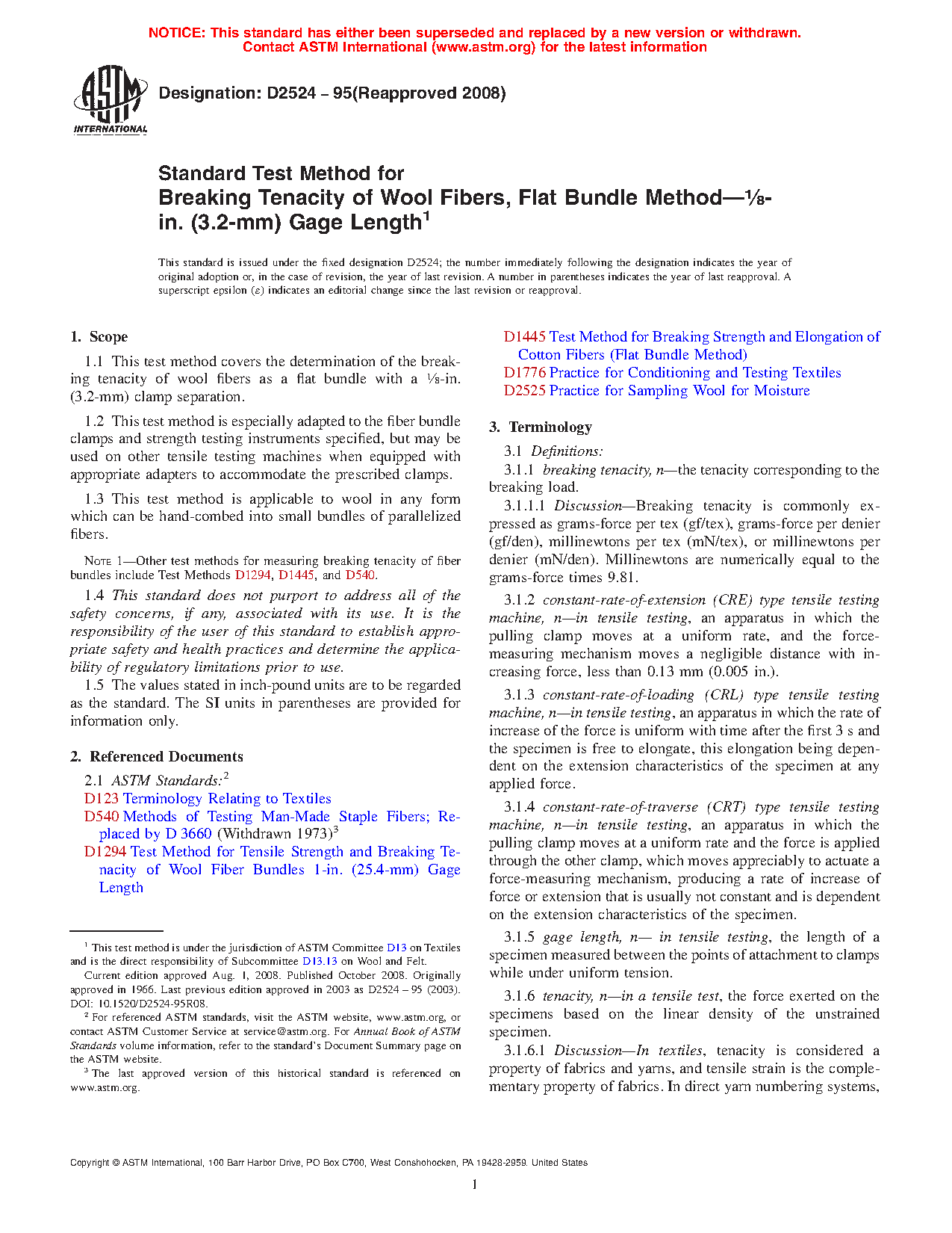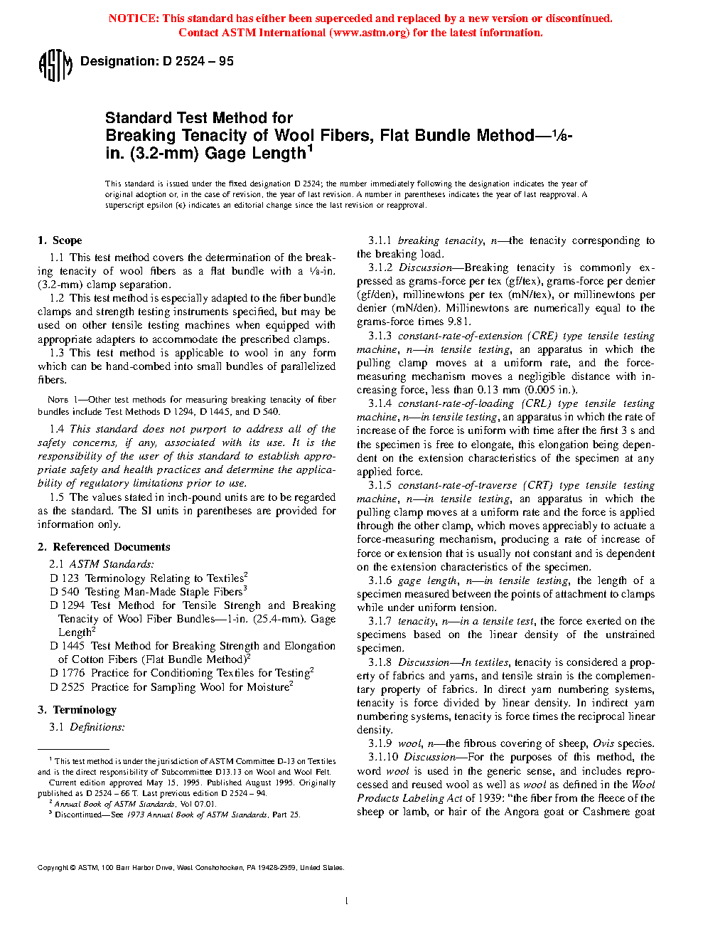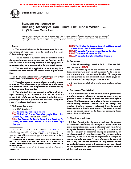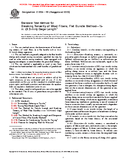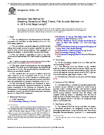 1.1 This test method covers the determination of the breaking tenacity of wool fibers as a flat bundle with a 1/8 in. (3.2 mm) clamp separation.