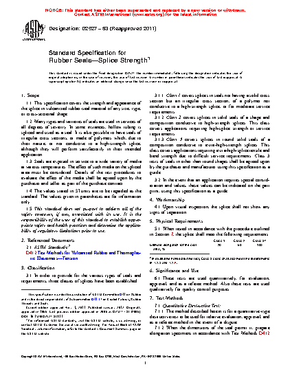 1.2 Many types and varieties of seals are used in services of all degrees of severity. In some instances, hollow tubing is spliced and used as a seal. It is also possible to have seals of irregular cross sections, or made of polymers which, due to their nature, or not conducive to a high-strength splice, although they will perform satisfactorily in their intended application.