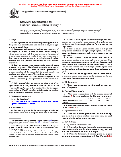 This specification covers splices in vulcanized rubber-seal material of any size, type, or cross-sectional shape having applications in services of all degrees of severity. The splices under this specification are divided into three classes based on splice strength and the appearance of the seal. Under Class 1 are splices in seals having an irregular cross section or are made of polymers not conducive to a high-strength splice, and hence are appropriate for applications with moderate service requirements. Splices under Class 2 are those found in solid seals having a shape and composition conducive to a high-strength splice, and hence are appropriate for applications with high service requirements. Class 3 is comprised of splices in round solid seals conducive to extra-high-strength splices. Splices under this class are appropriate for applications with difficult service requirements; that is, applications requiring splices of extra-high tensile and bend strength. Quantitative destructive and qualitative nondestructive tests shall be performed on the spliced area of the seal and shall conform to the physical requirements specified, in particular the ultimate elongation for the seal area.