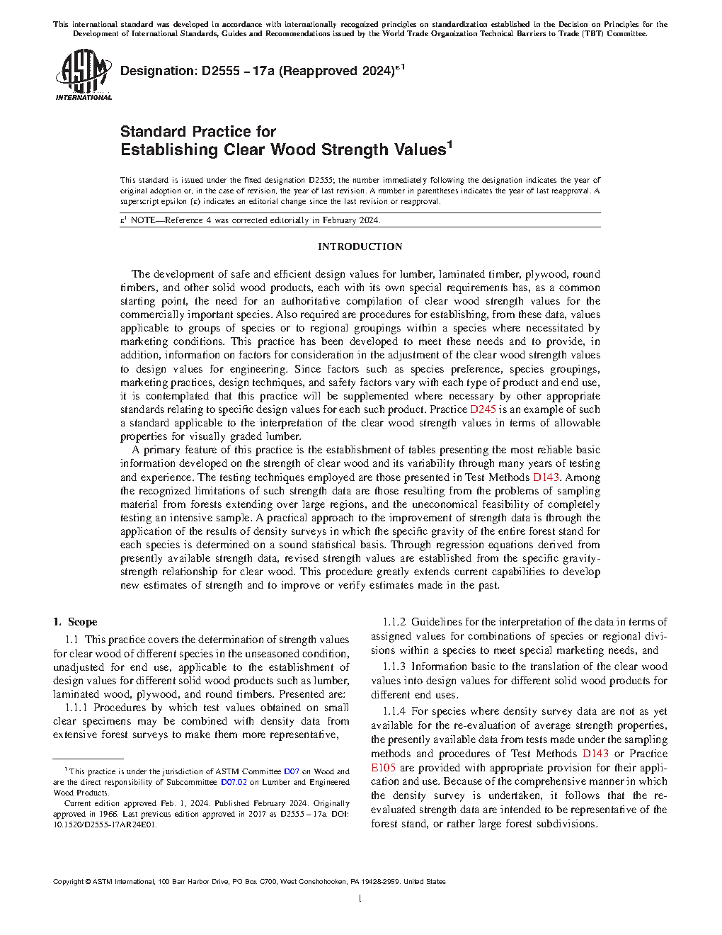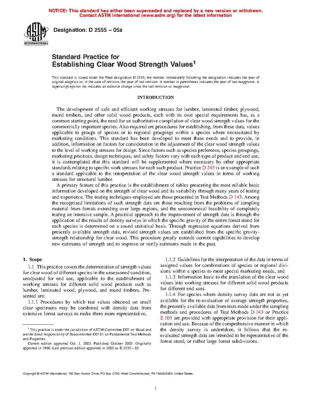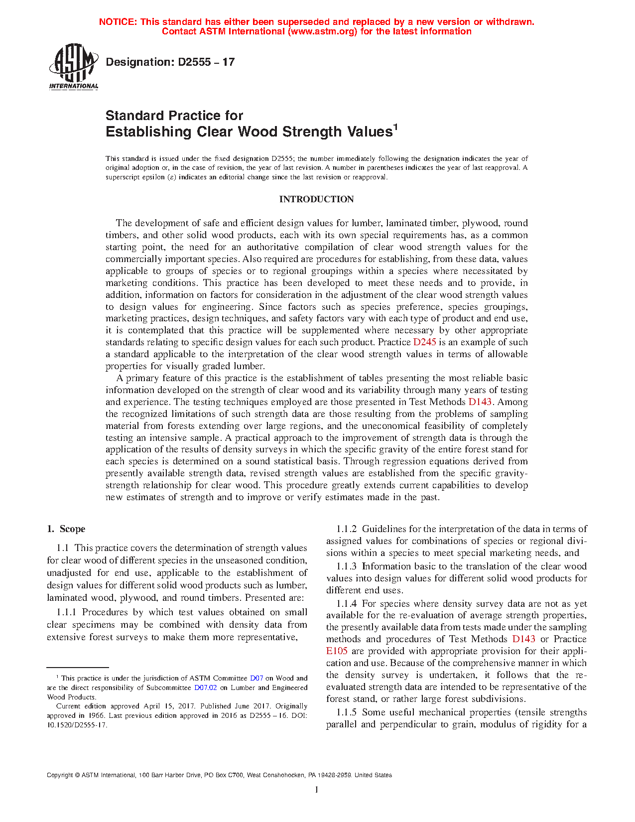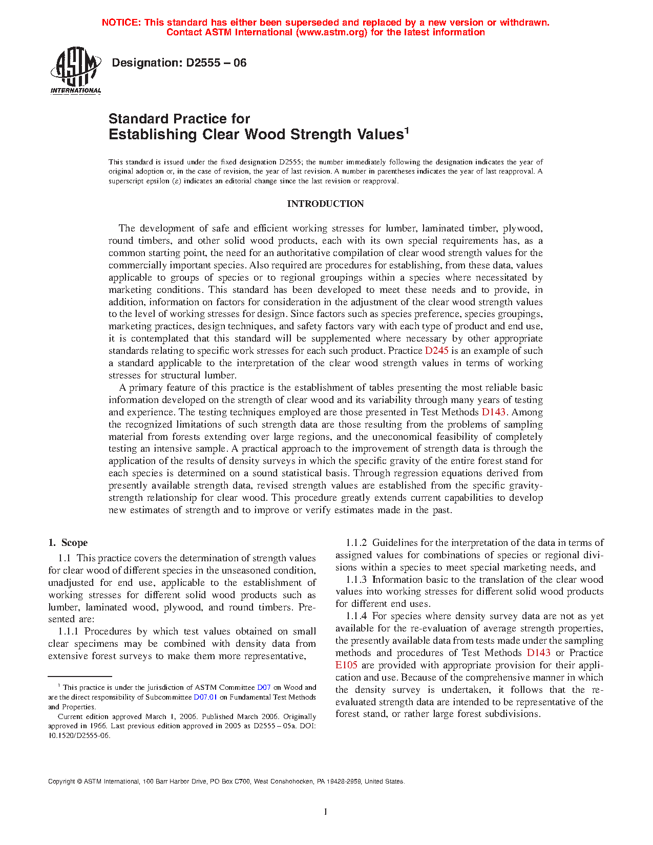 1.1.4 For species where density survey data are not as yet available for the re-evaluation of average strength properties, the presently available data from tests made under the sampling methods and procedures of Test Methods D143 or Practice E105 are provided with appropriate provision for their application and use. Because of the comprehensive manner in which the density survey is undertaken, it follows that the re-evaluated strength data are intended to be representative of the forest stand, or rather large forest subdivisions.