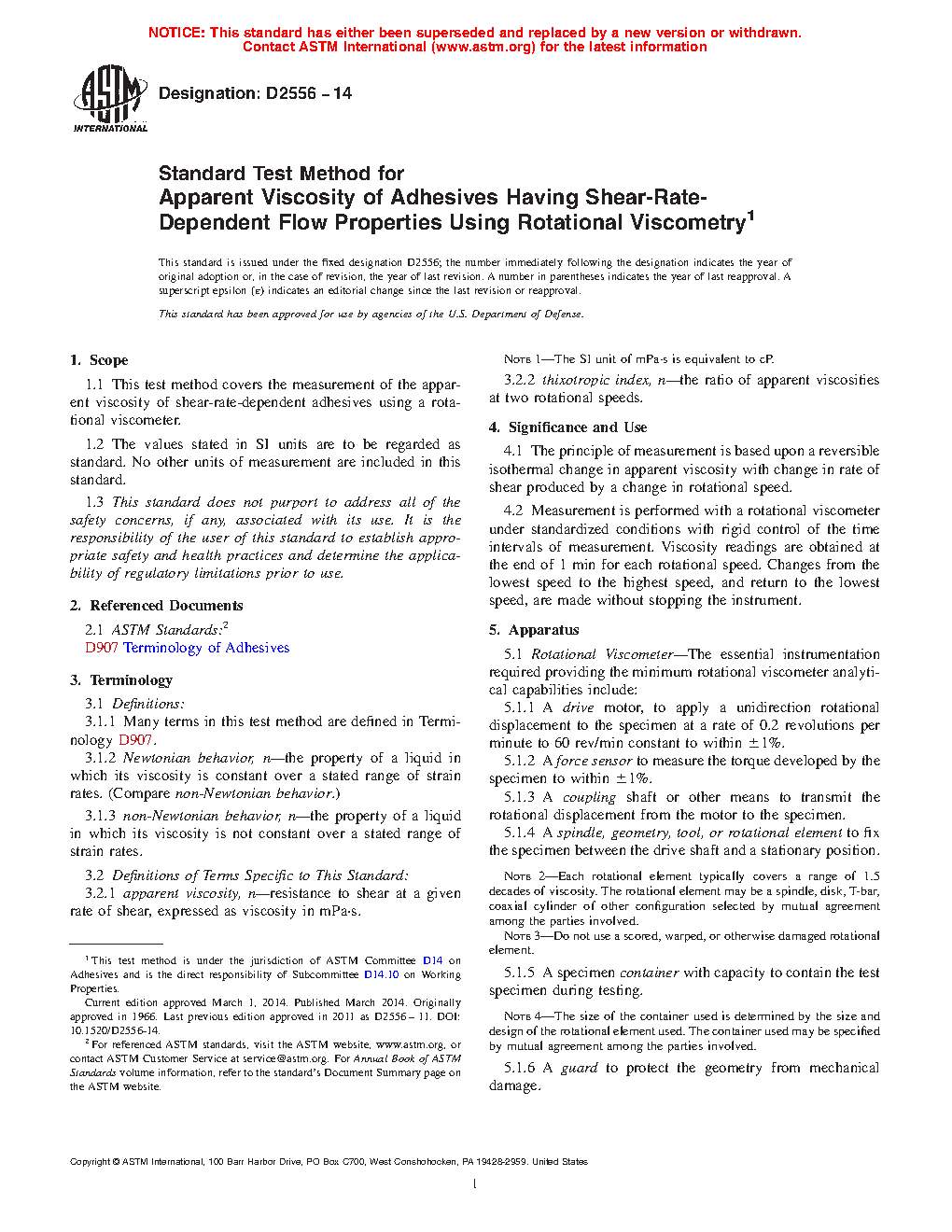 1.1 This test method covers the measurement of the apparent viscosity of shear-rate-dependent adhesives using a rotational viscometer.