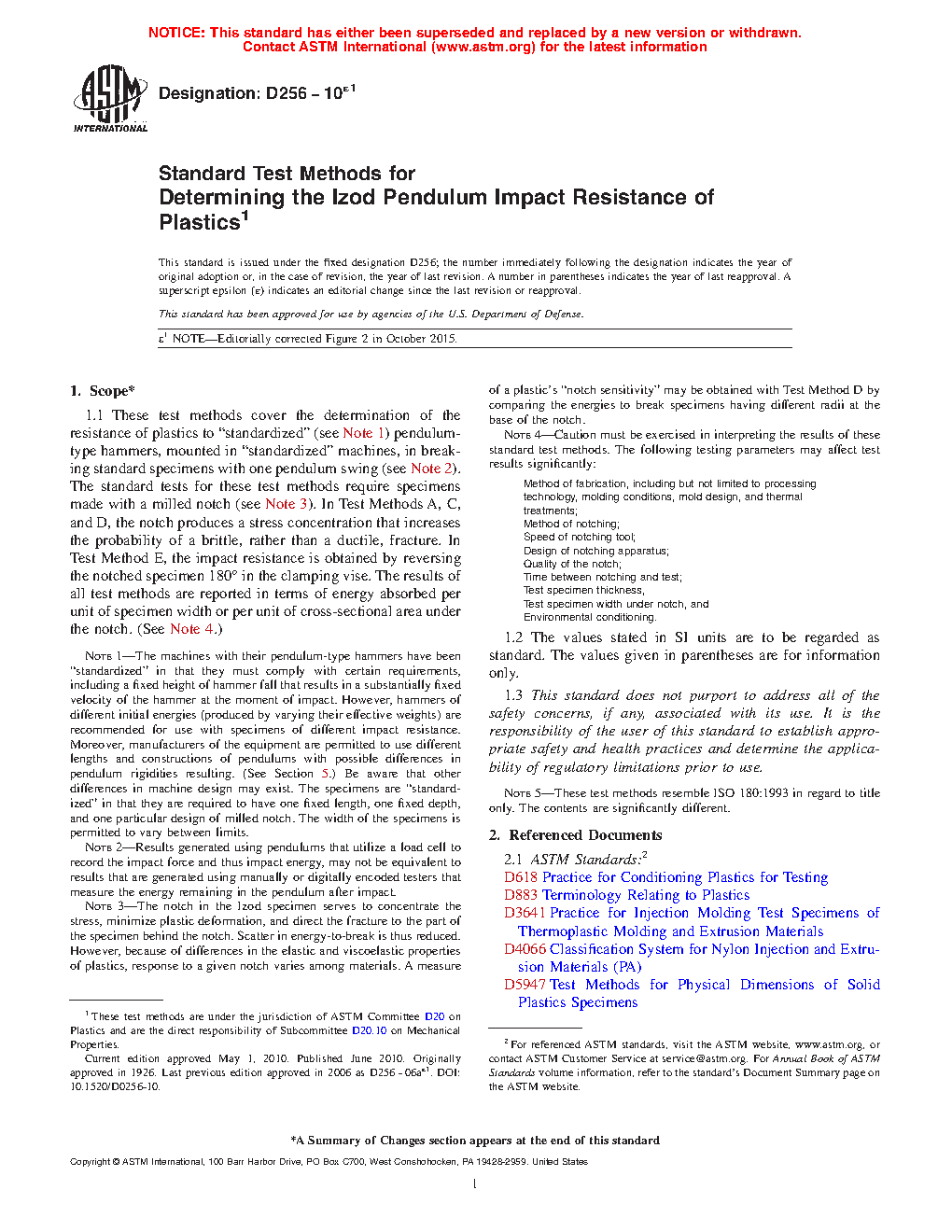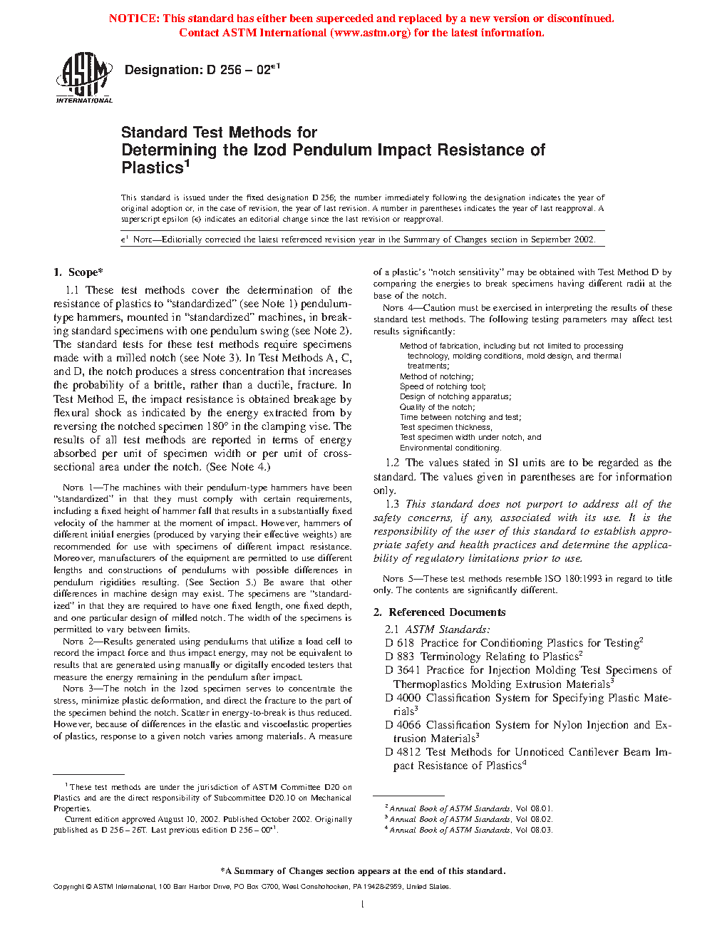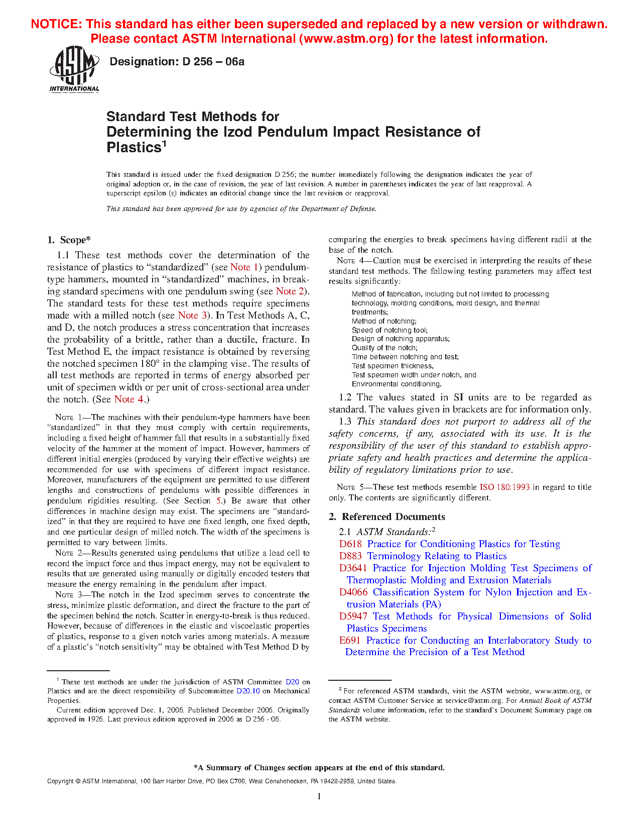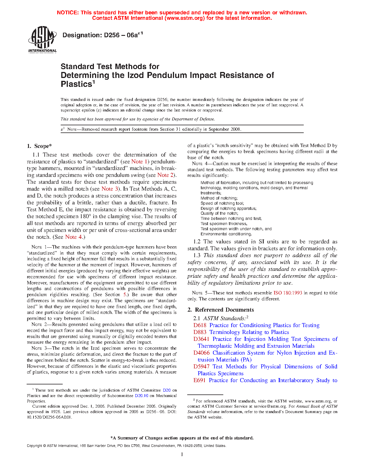 1.1 These test methods cover the determination of the resistance of plastics to “standardized” (see Note 1) pendulum-type hammers, mounted in “standardized” machines, in breaking standard specimens with one pendulum swing (see Note 2). The standard tests for these test methods require specimens made with a milled notch (see Note 3). In Test Methods A, C, and D, the notch produces a stress concentration that increases the probability of a brittle, rather than a ductile, fracture. In Test Method E, the impact resistance is obtained by reversing the notched specimen 180° in the clamping vise. The results of all test methods are reported in terms of energy absorbed per unit of specimen width or per unit of cross-sectional area under the notch. (See Note 4.)