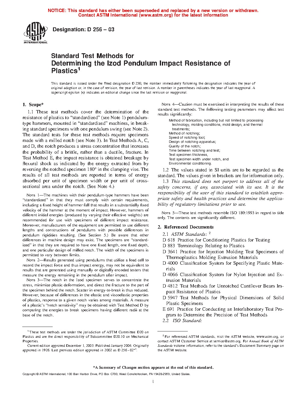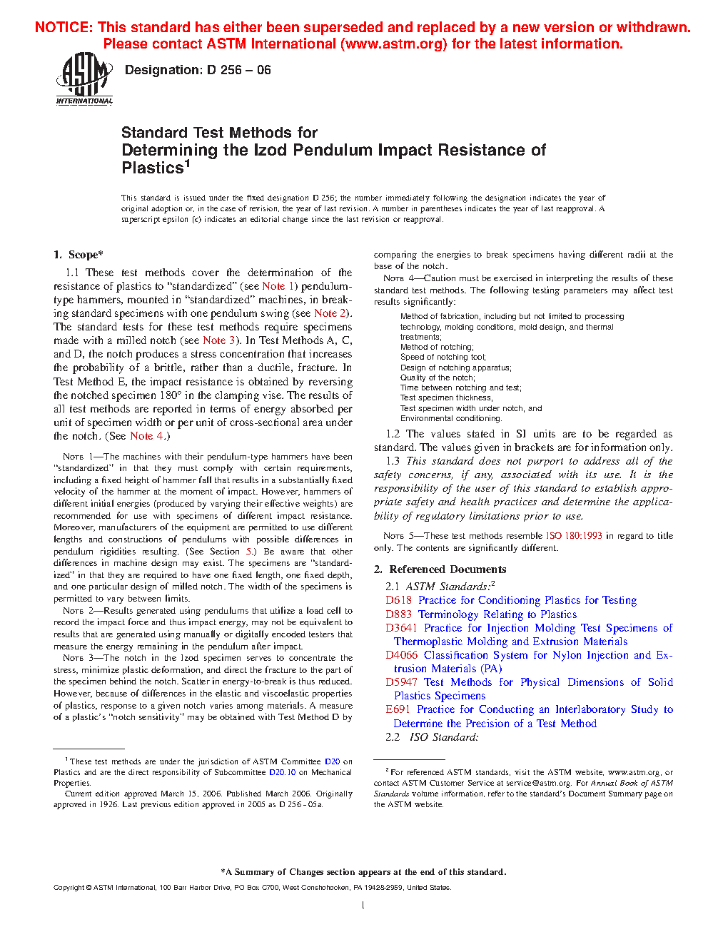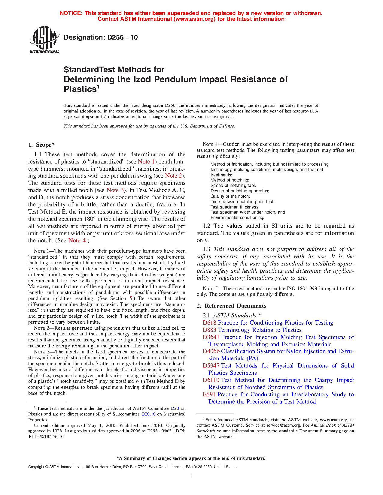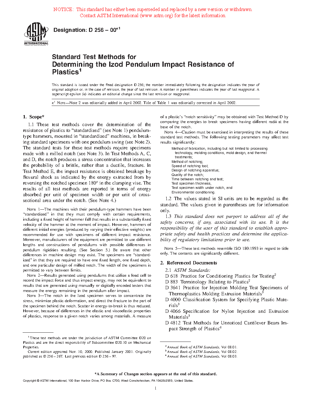 1.1 These test methods cover the determination of the resistance of plastics to “standardized” (see Note 1) pendulum-type hammers, mounted in “standardized” machines, in breaking standard specimens with one pendulum swing (see Note 2). The standard tests for these test methods require specimens made with a milled notch (see Note 3). In Test Methods A, C, and D, the notch produces a stress concentration that increases the probability of a brittle, rather than a ductile, fracture. In Test Method E, the impact resistance is obtained by reversing the notched specimen 180° in the clamping vise. The results of all test methods are reported in terms of energy absorbed per unit of specimen width or per unit of cross-sectional area under the notch. (See Note 4.)