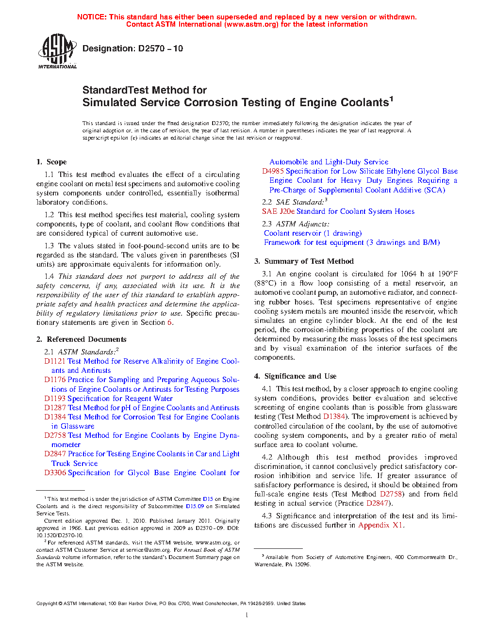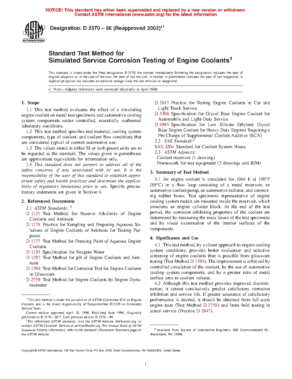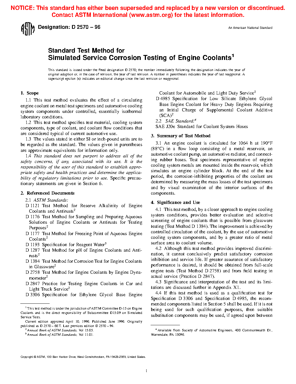 1.1 This test method evaluates the effect of a circulating engine coolant on metal test specimens and automotive cooling system components under controlled, essentially isothermal laboratory conditions.