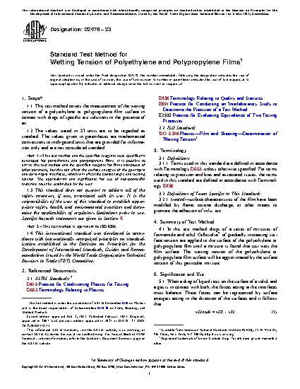 1.1 This test method covers the measurement of the wetting tension of a polyethylene or polypropylene film surface in contact with drops of specific test solutions in the presence of air.