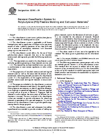 1.1 This specification provides for the identification of polybutylene plastics molding and extrusion materials in such manner that the manufacturer and the purchaser can agree on the acceptability of different lots or shipments. The tests involved in this specification are intended to provide information for identifying materials according to types and categories. It is not the function of this specification to provide specific engineering data for design purposes.