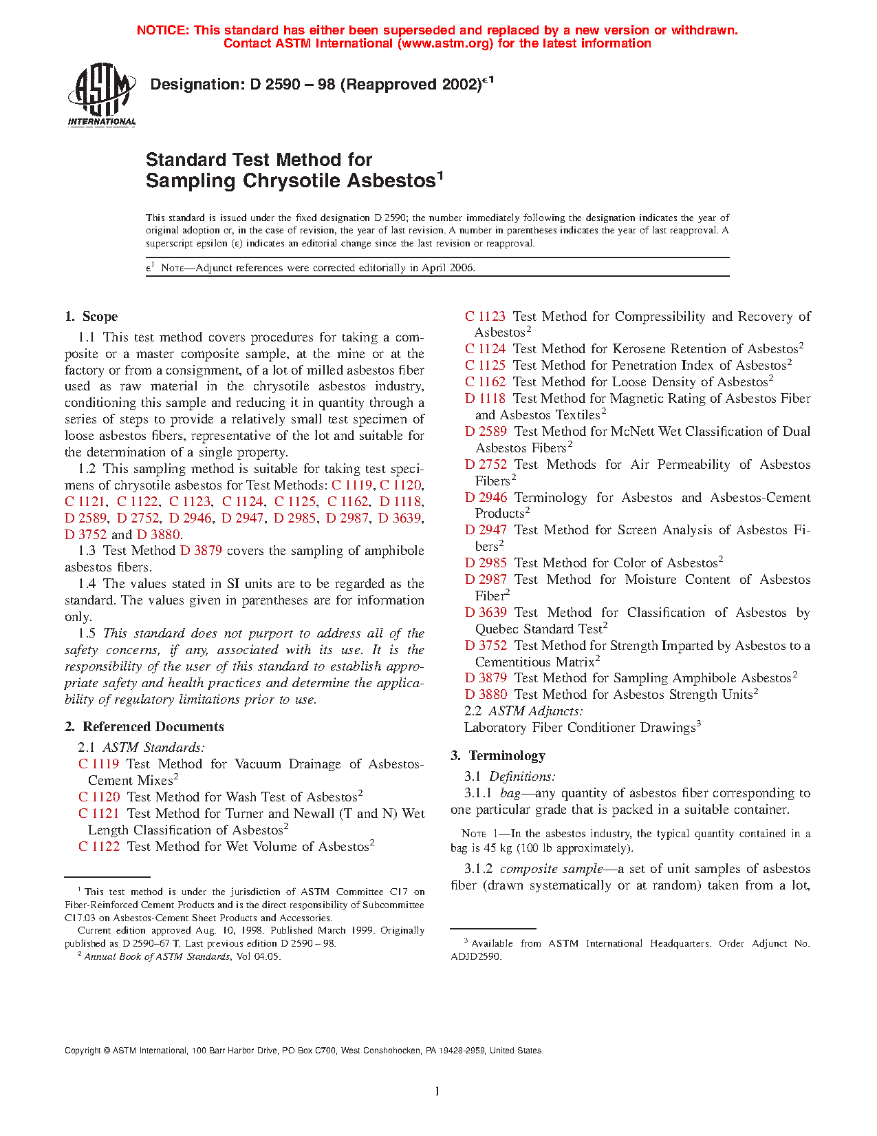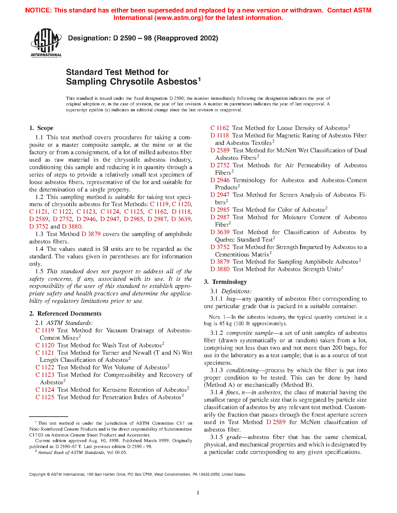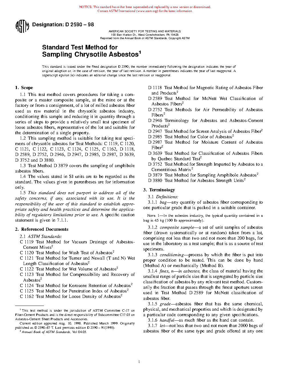 1.2 This sampling method is suitable for taking test specimens of chrysotile asbestos for Test Methods: C 1119, C 1120, C 1121, C 1122, C 1123, C 1124, C 1125, C 1162, D 1118, D 2589, D 2752, D 2946, D 2947, D 2985, D 2987, D 3639, D 3752 and D 3880.
