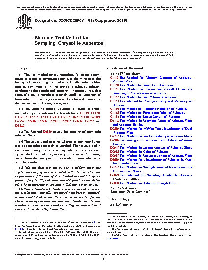 1.2 This sampling method is suitable for taking test specimens of chrysotile asbestos for Test Methods: C1119, C1120, C1121, C1122, C1123, C1124, C1125, C1162, D1118, D2589, D2752, D2946, D2947, D2985, D2987, D3639, D3752 and D3880.