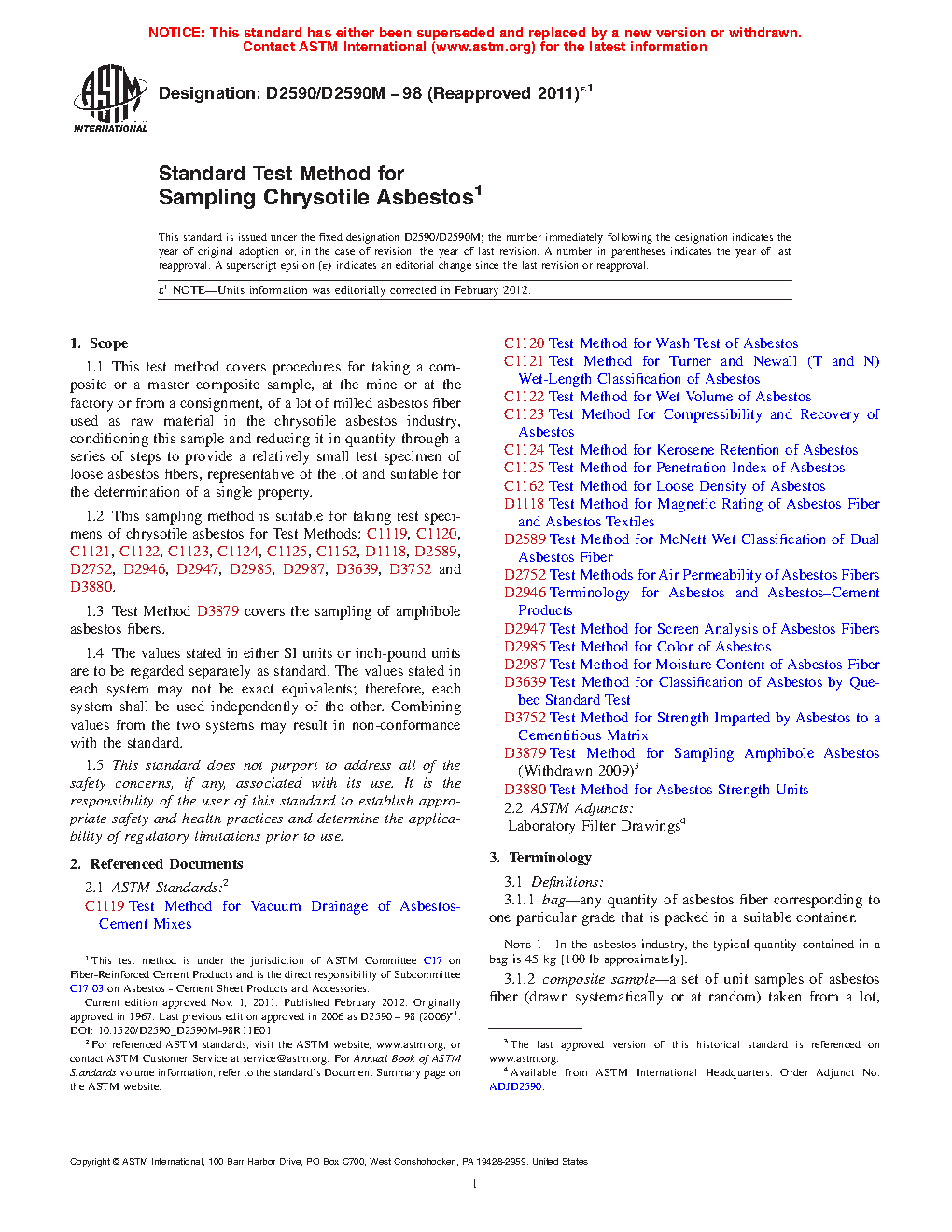 1.2 This sampling method is suitable for taking test specimens of chrysotile asbestos for Test Methods: C1119, C1120, C1121, C1122, C1123, C1124, C1125, C1162, D1118, D2589, D2752, D2946, D2947, D2985, D2987, D3639, D3752 and D3880.