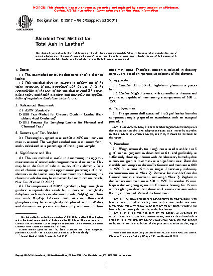 1.1 This test method covers the determination of total ash in leather.