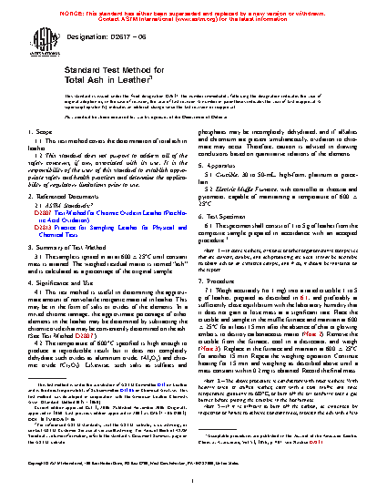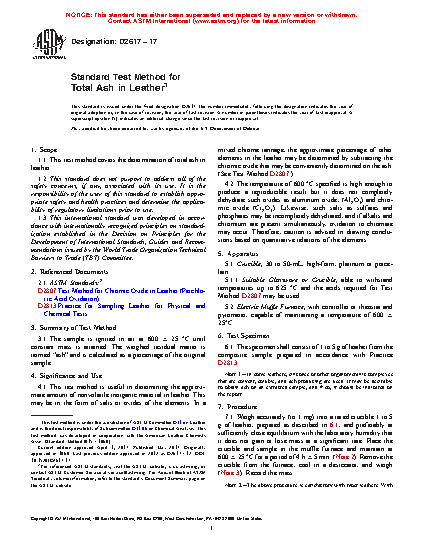 4.1 This test method is useful in determining the approximate amount of nonvolatile inorganic material in leather. This may be in the form of salts or oxides of the elements. In a mixed chrome tannage, the approximate percentage of other elements in the leather may be determined by subtracting the chromic oxide that may be conveniently determined on the ash. (See Test Method D2807.)