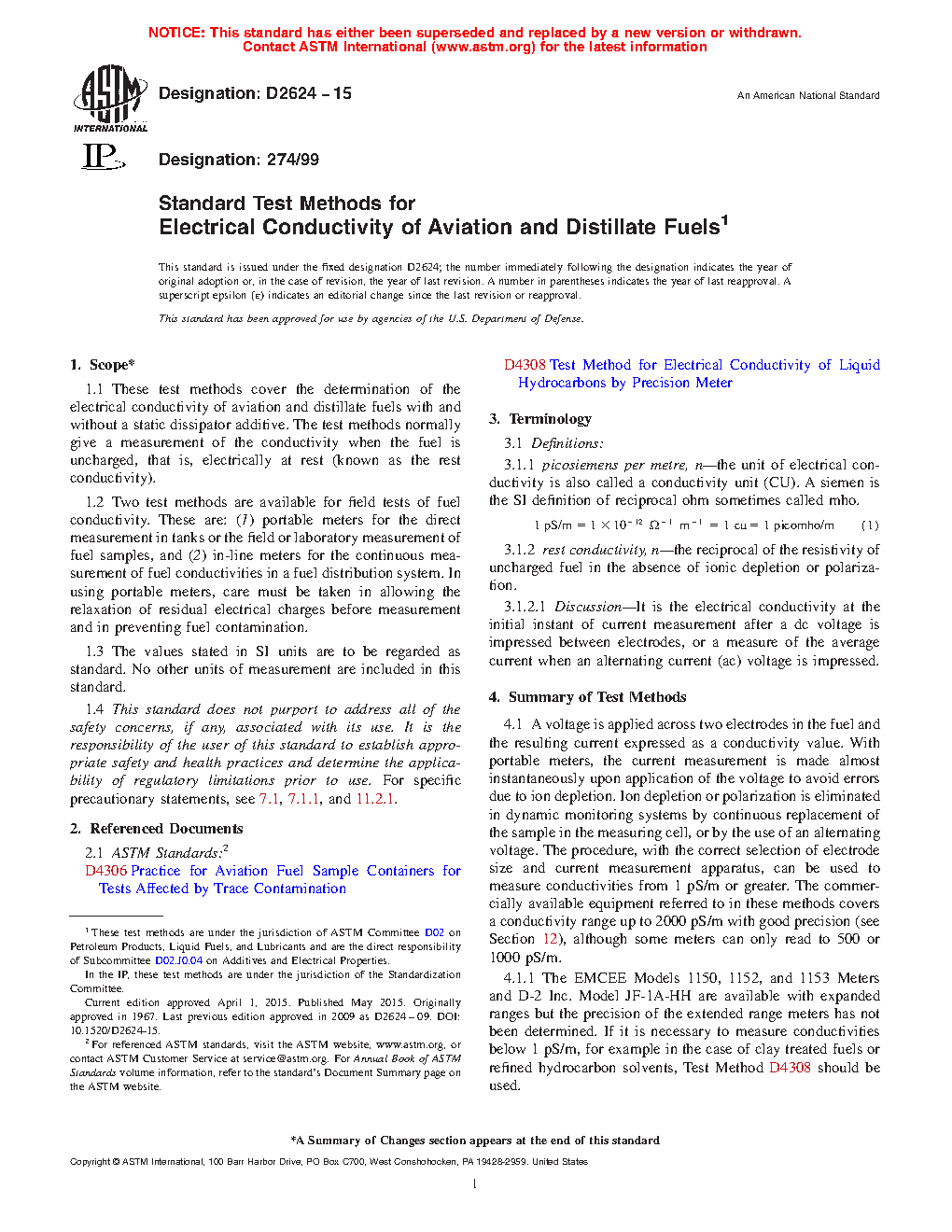 1.1 These test methods cover the determination of the electrical conductivity of aviation and distillate fuels with and without a static dissipator additive. The test methods normally give a measurement of the conductivity when the fuel is uncharged, that is, electrically at rest (known as the rest conductivity).