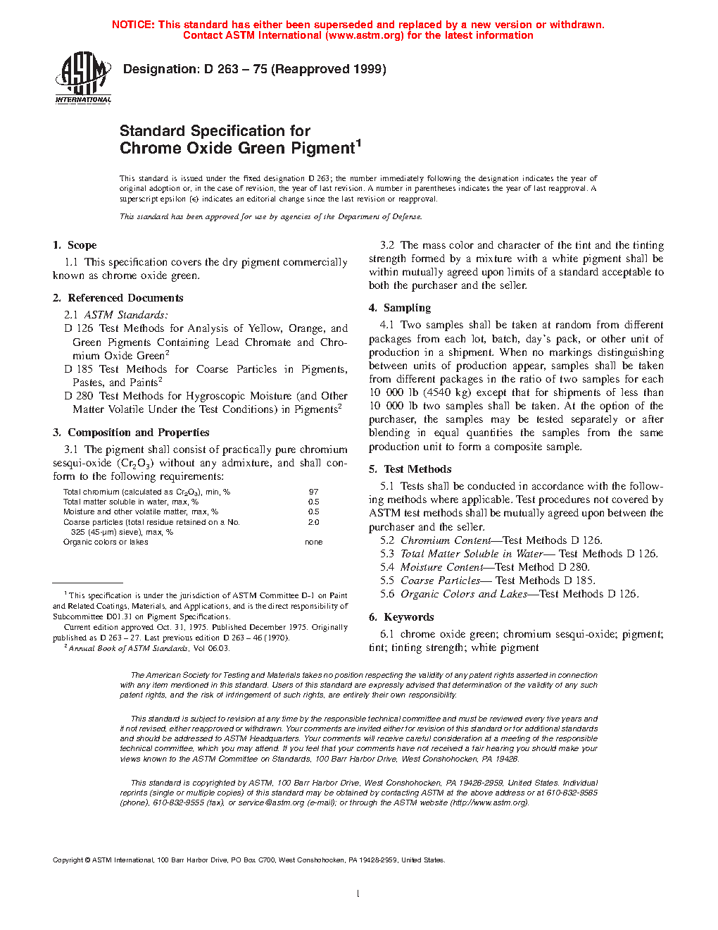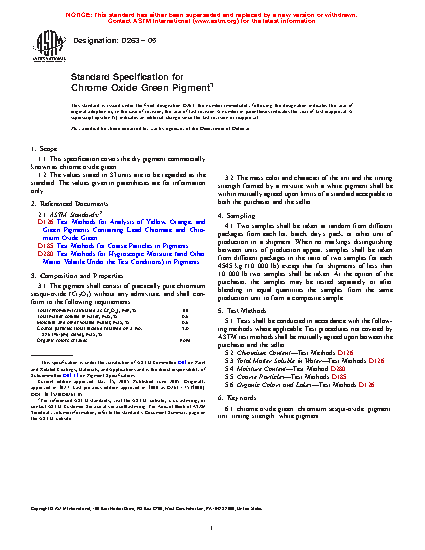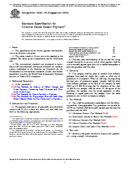 This specification establishes the properties and requirements for the dry pigment commercially known as chrome oxide green. The pigment shall consist of practically pure chromium sesqui-oxide without any admixture. Specimens shall be sampled and tested adequately, and shall conform to the following composition requirements: total chromium; total water-soluble matter; moisture and other volatile matter; coarse particles (total residue retained on a No. 325 sieve); and organic colors or lakes. The pigments shall adhere to mass color, tint character, and tinting strength requirements as well.