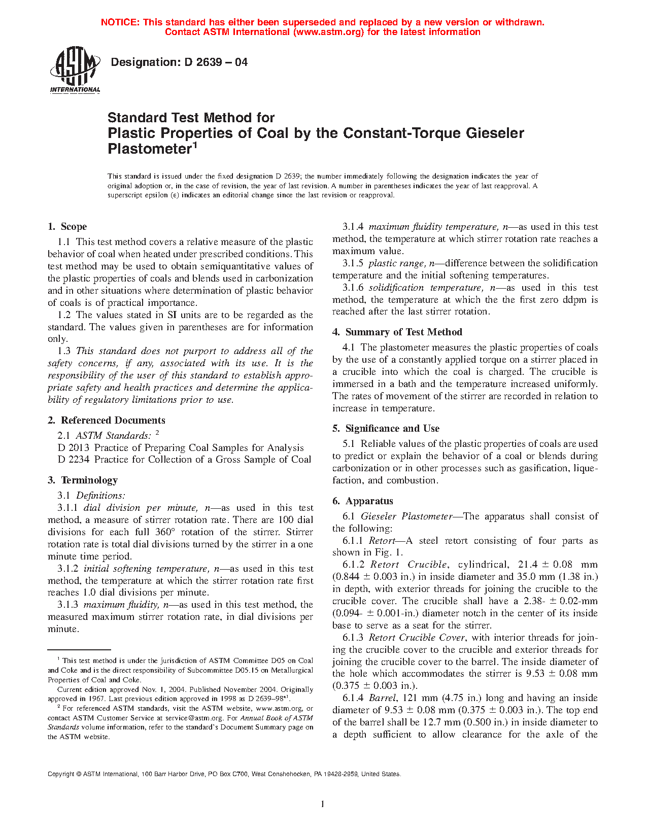 Standard Test Method for Plastic Properties of Coal by the Constant-Torque Gieseler Plastometer
