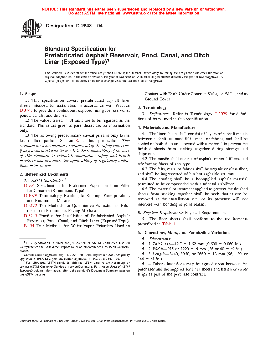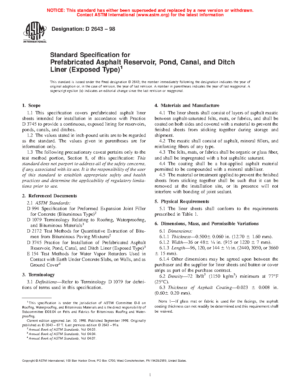 This specification covers prefabricated asphalt liner sheets intended for installation to provide a continuous, exposed lining for reservoirs, ponds, canals, and ditches. The liner sheets shall consist of layers of asphalt mastic between asphalt-saturated felts, mats, or fabrics, and shall be coated on both sides and covered with a material to prevent the finished sheets from sticking together during storage and shipment. The coating shall be a hot-applied asphalt material permitted to be compounded with a mineral stabilizer. Thickness of asphalt coating, water absorption, mass percent of asphalt, resistance to decay, flexibility, brittleness, and heat dissipation tests shall be performed to conform to the requirements specified.