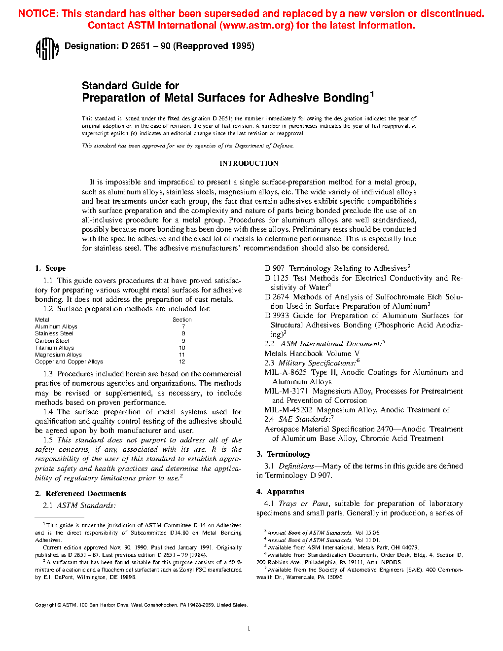 This guide covers procedures for preparing various wrought metal surfaces for adhesive bonding. Surface treatment methods involving both mechanical and chemical techniques are included for aluminum alloys, stainless steel, carbon steel, titanium alloys, magnesium alloys, and copper and copper alloys. For aluminum alloys: vapor or non-etching alkaline degreasing; sulfuric acid-sodium dichromate or sulfuric acid-ferric sulfate solution etching; phosphoric and sulfuric acid anodizing; propriety cleaning; secondary bonding; brush plate bond etching; mechanical abrasion; electrochemical cleaning; and anodic etching may be used. For stainless steel: mechanical methods such as wire brushing, rubbing with metal wool, hand sanding, and dry sand, grit, or vapor blast honing; etching using sulfuric-nitric-hydrofluoric, hydrochloric-orthosphosphoric-hydrofluoric, sulfuric-sodium dichromate, sodium metasilicate, and hydrochloric-sulfuric-dichromate acid solutions; and vigorous scouring with wet cloth and commercial household cleaner may be used. Same mechanical methods as that employed in stainless steel and chemical etching by nitric-phosphoric acid solution may be used for carbon steel preparation. For titanium alloys: mechanical abrasion; hydrochloric-orthophosphoric-hydrofluoric acid solution etching; and chromic acid or fluoride anodizing may be used. Surface preparation for magnesium alloys which is closely associated with corrosion prevention shall involve vapor, alkaline-detergent solution, chromic acid, and sodium hydroxide acid degreasing; anodic treatment; and the use of conversion coatings and wash primers. Nitric acid-ferric chloride solution degreasing; sulfuric acid-dichromate-ferric sulfate solution etching; and chemical treatment by nitric-acid-sodium chlorite solutions may be used for copper and copper alloy preparation.
