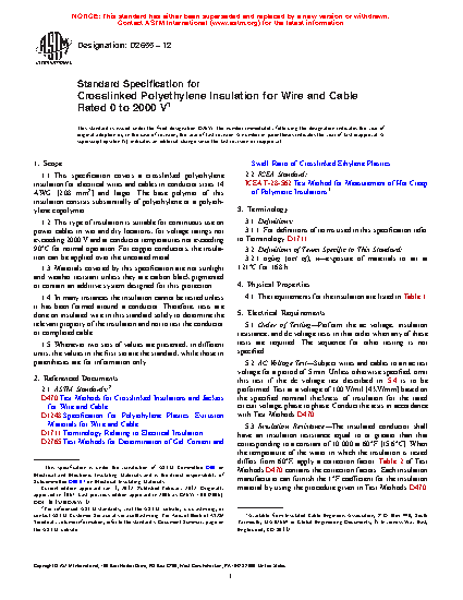 1.1 This specification covers a crosslinked polyethylene insulation for electrical wires and cables in conductor sizes 14 AWG [2.08 mm2] and larger. The base polymer of this insulation consists substantially of polyethylene or a polyethylene copolymer.